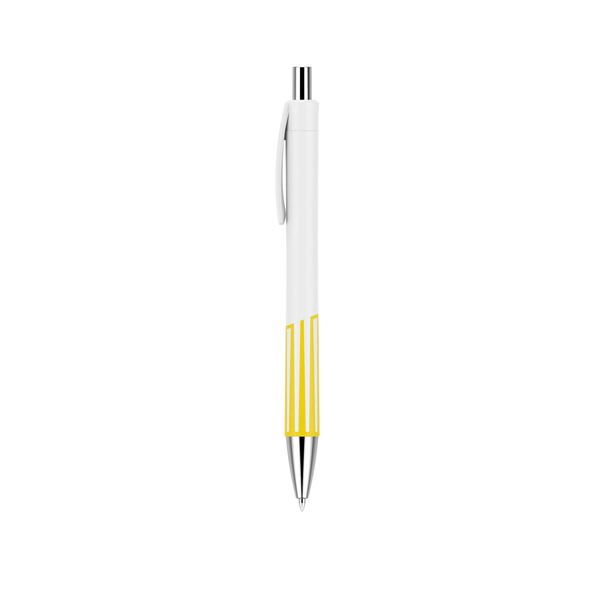[short_description] => Eye catching, slim line plastic ball point pen with white rubber grip.