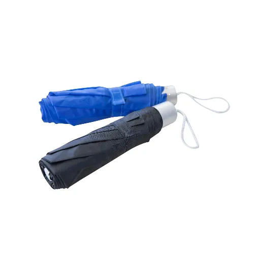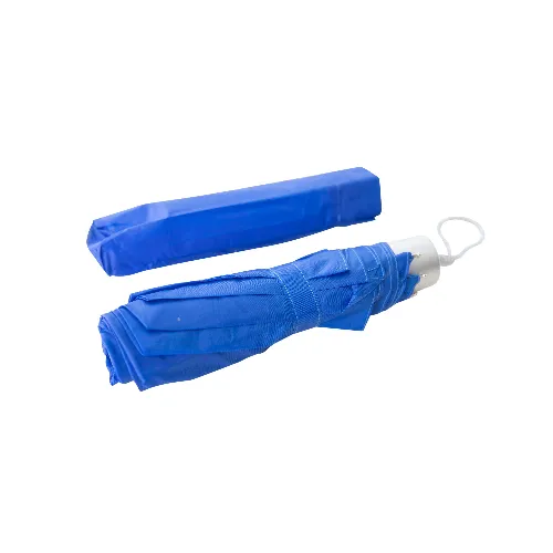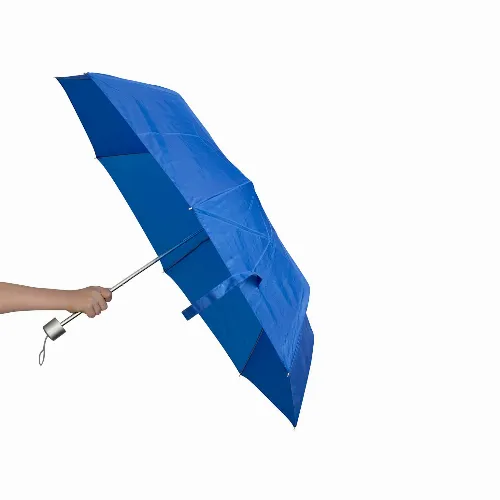 Compact umbrella 98cm diameter with 8 ribs. 190T polyester with silver plastic handle. Manual open . Packed in matching coloured sleeve. Available in blue or black.