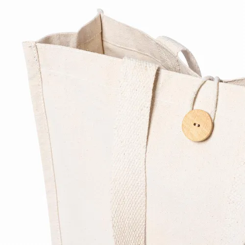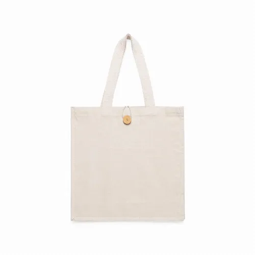 With original button closure, stitched finish and gusset. Extra wide and reinforced medium handles (60 x 3,5 cm). Resistance up to 10 kg weight.