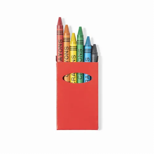 Set of 6 crayons in cardboard box with window and in glossy bright tones.