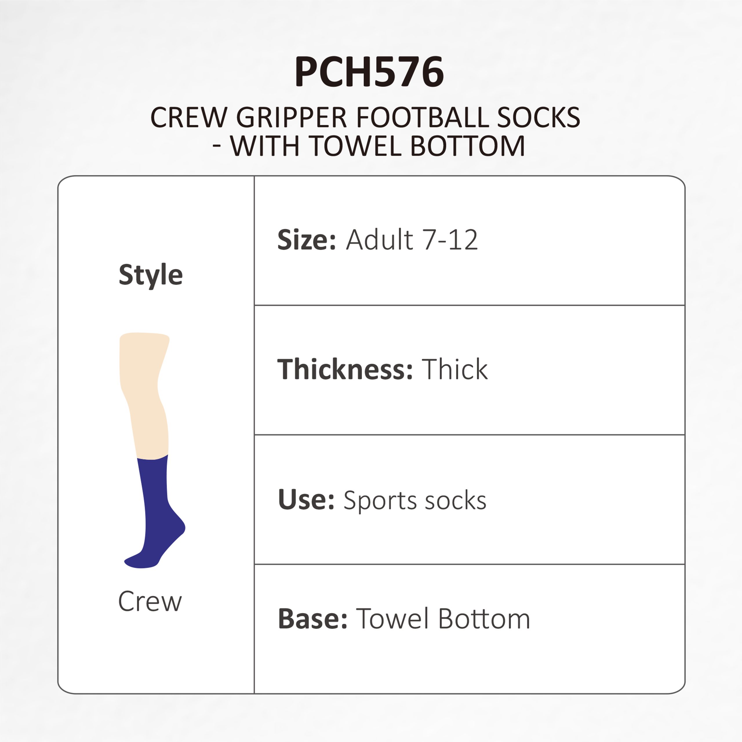 Create your own unique socks with our Crew Gripper Football Socks – With Towel Bottom! Made of Cotton, Polyester & Spandex material, which is soft and comfortable. Non-slip grip points along the entire sole for added grip. With jacquard craft to highlight your design. These stylish and comfortable non-slip socks will provide you with the grip for extra control while on the sports field