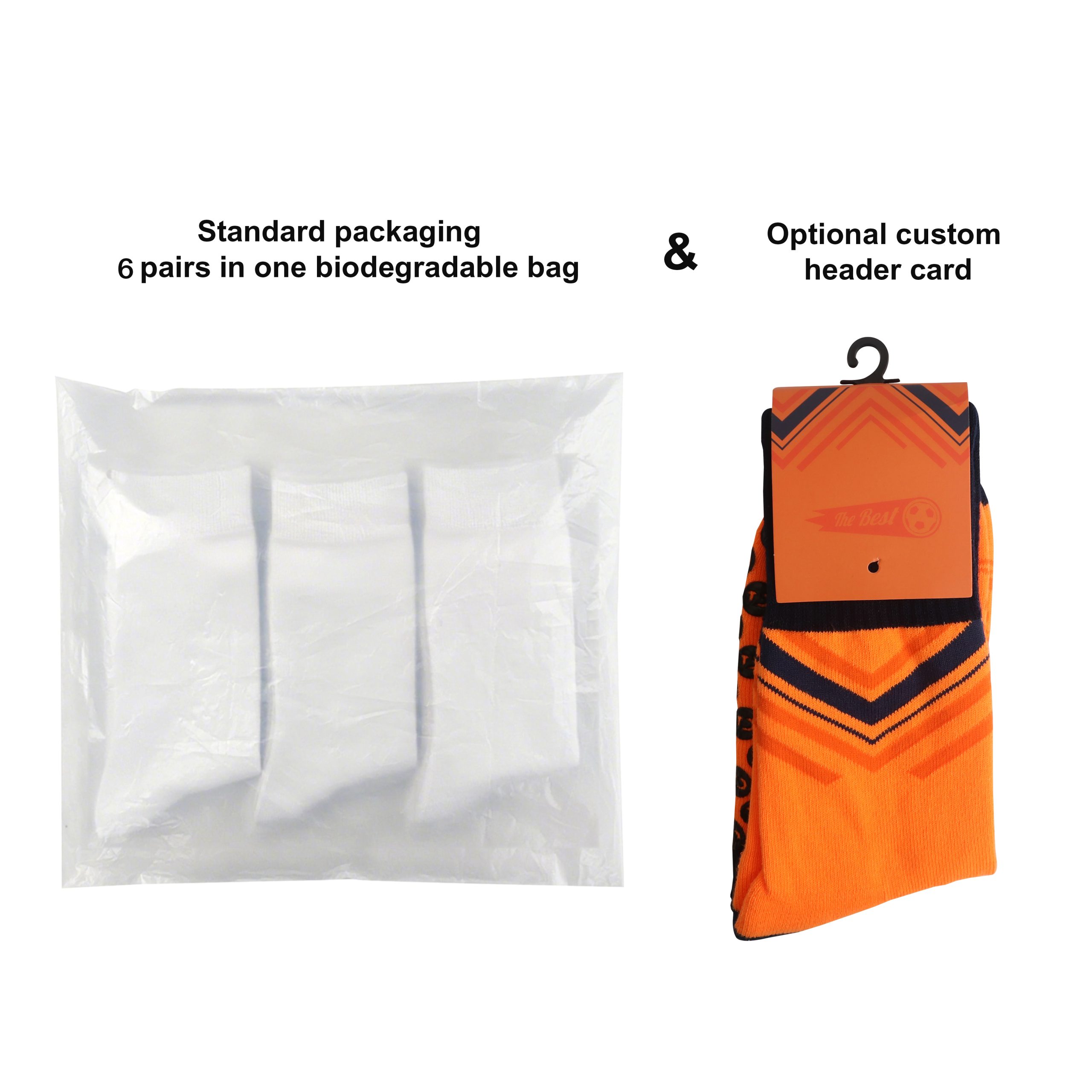 Biodegradable bag included.<br/>Please note, price is per pair. Minimum quantity for one size is 250 pairs.<br/>Price includes 4 colours. Up to 6 can be achieved, but this may increase the time to finalise the pre production sample, and cost. Please talk to us before placing your order. The more colours added to the design, the thicker the sock will become. <br/>