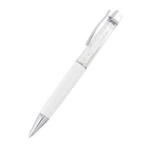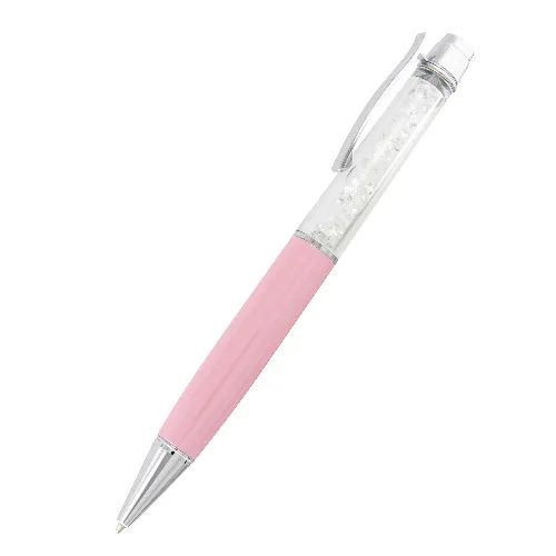 An elegant metal twist action ballpoint pen with quality crystals. The bottom half of the barrel comes in a solid colour while the top half is clear and filled with loose crystals, the pen has a shiny silver clip, fittings and tip. Parker style black ink refill.