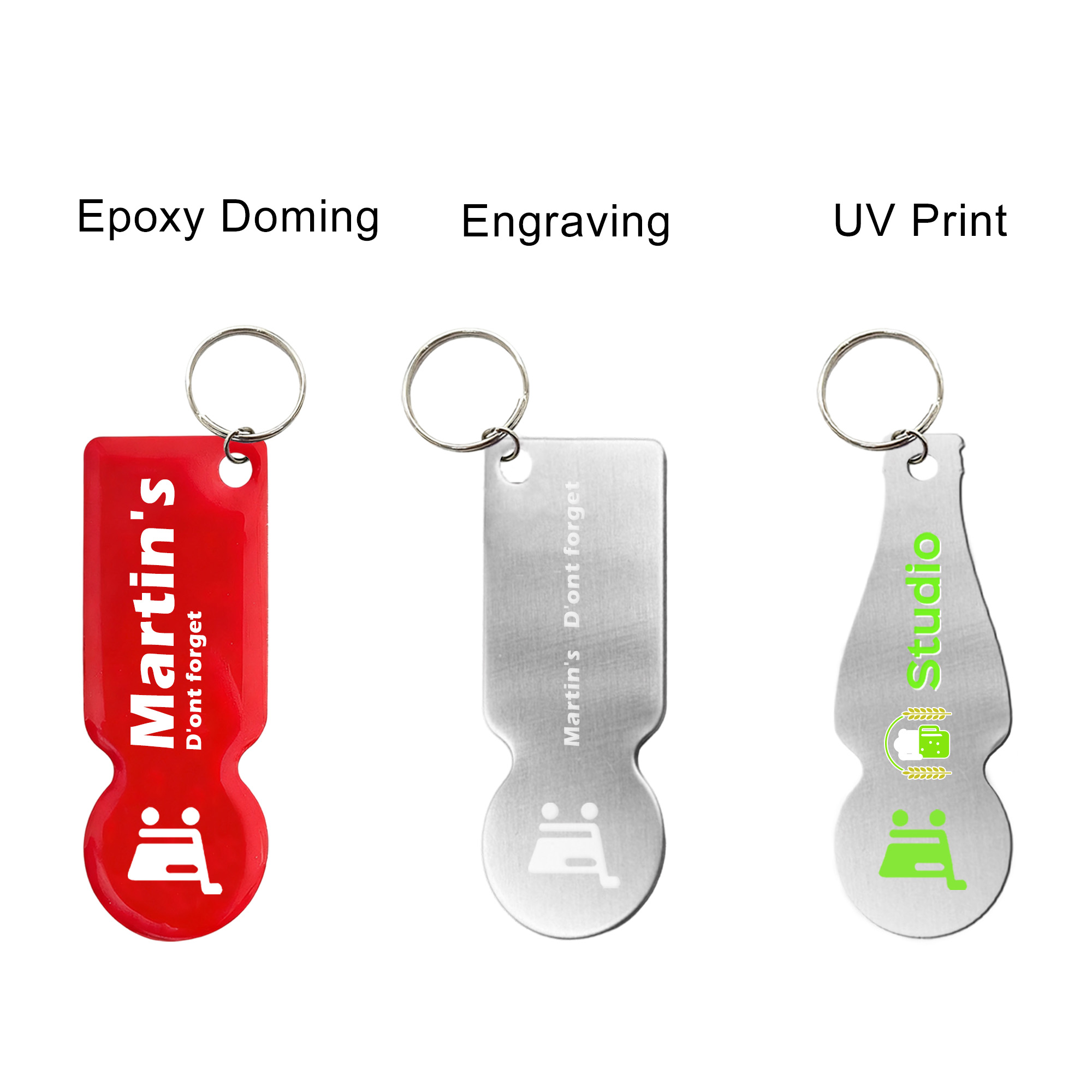 Elevate your brand with our Custom Shape Trolley Coin Keyring, crafted from high-quality stainless steel. Customised shapes can be made within dimensions of L61 x W23 x H1.6mm. Showcase your logos or designs on the front using epoxy doming for a smooth finish. Additional customisation is available on the back through UV printing or Engraving. Our keyring combines multiple functions, serving as a trolley coin and a keychain. Perfect for retail promotions, corporate gifts, or event giveaways.