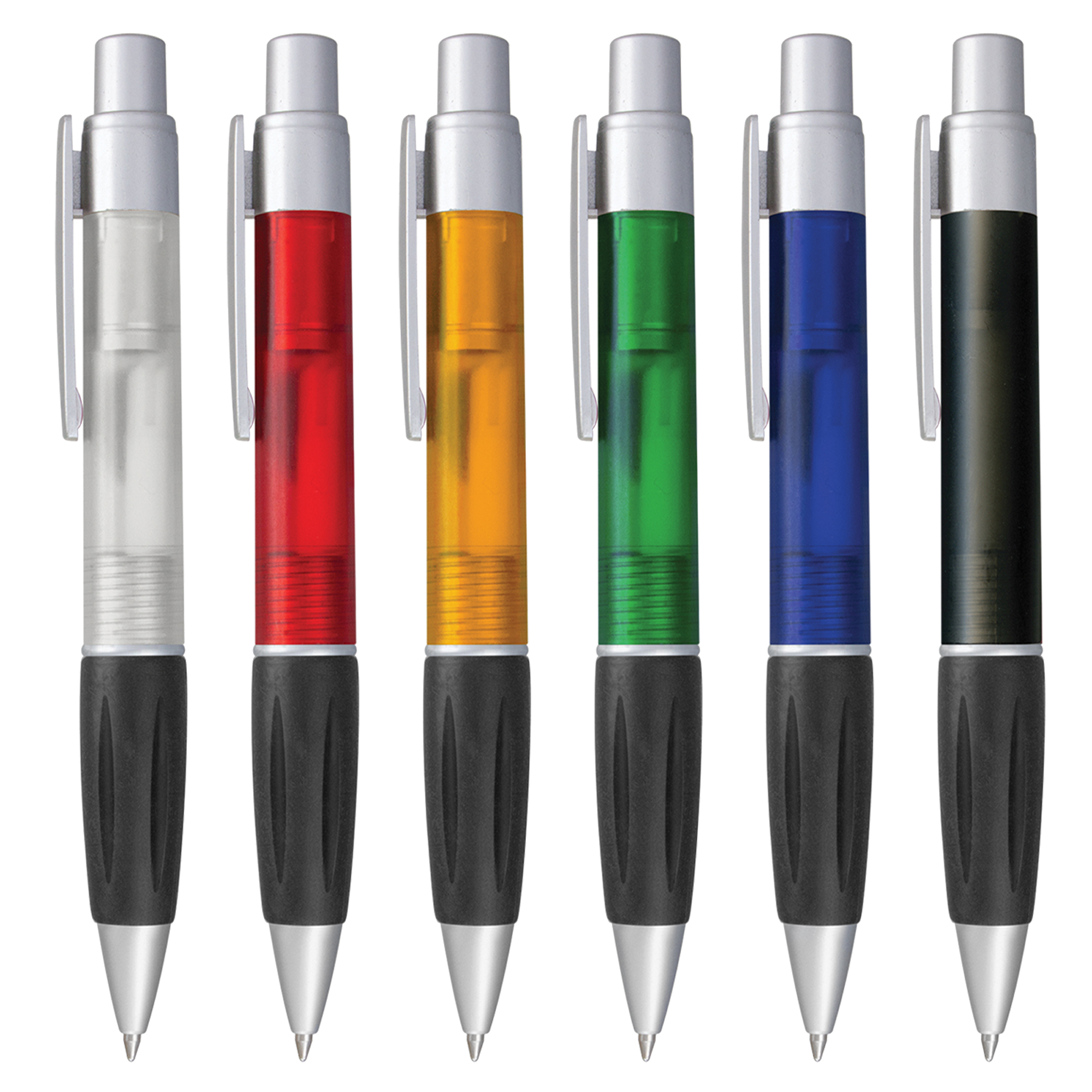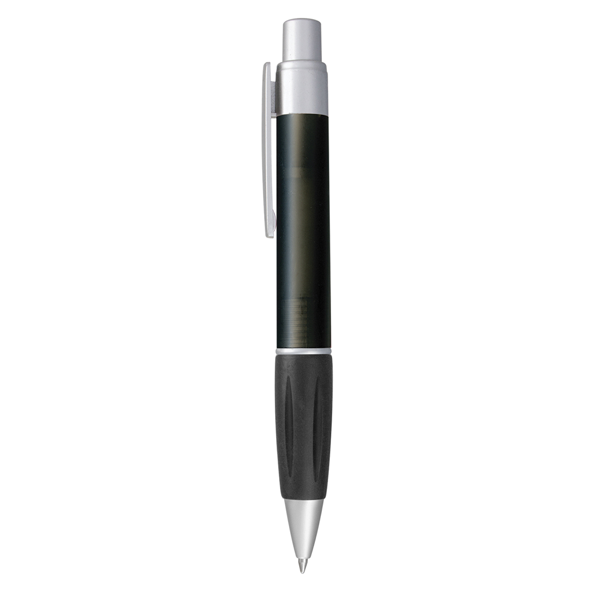 Retractable plastic pen with comfortable rubber grip frosted transparent barrel and matt silver trim this thick barrel provide a large printing area a great pen to deliver more information. It has high quality German manufactured black ink refill 1800 meters writing distance tungsten carbide ball provides you with quality writing.