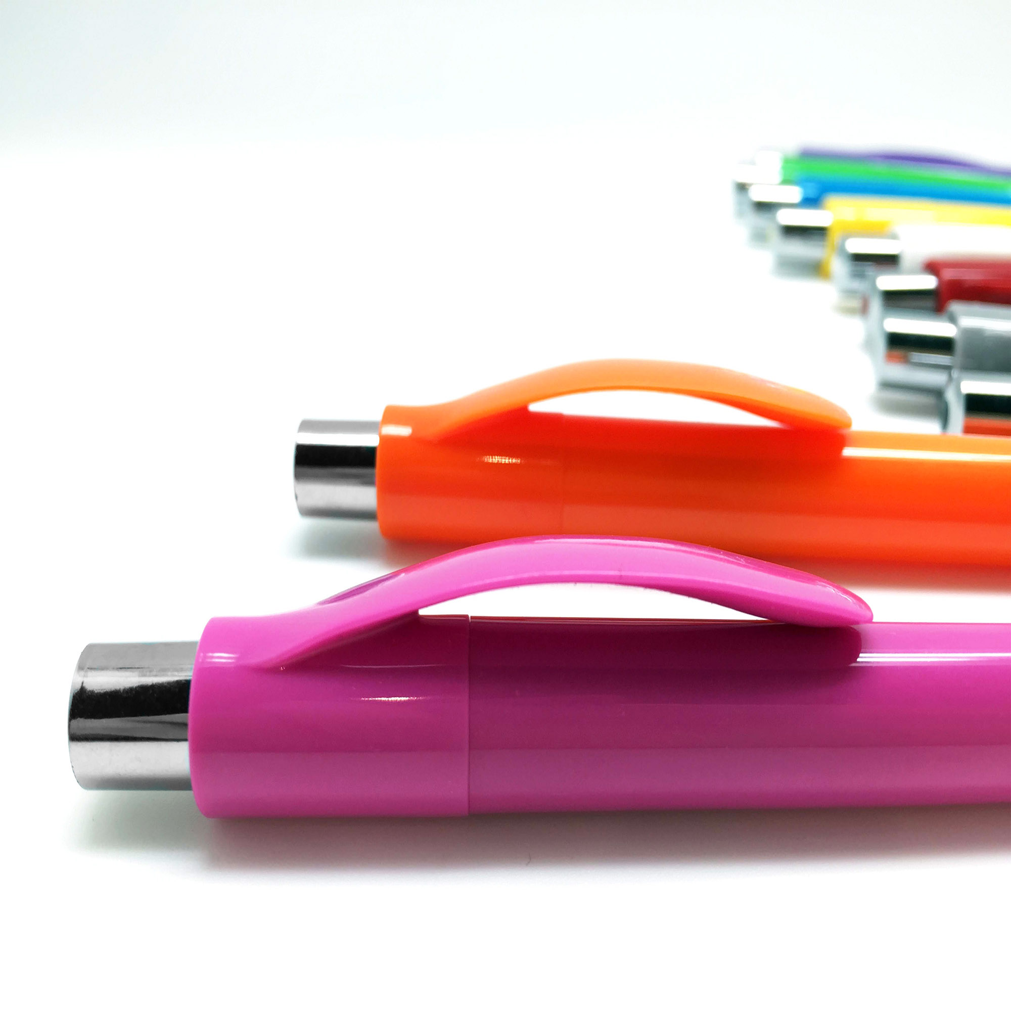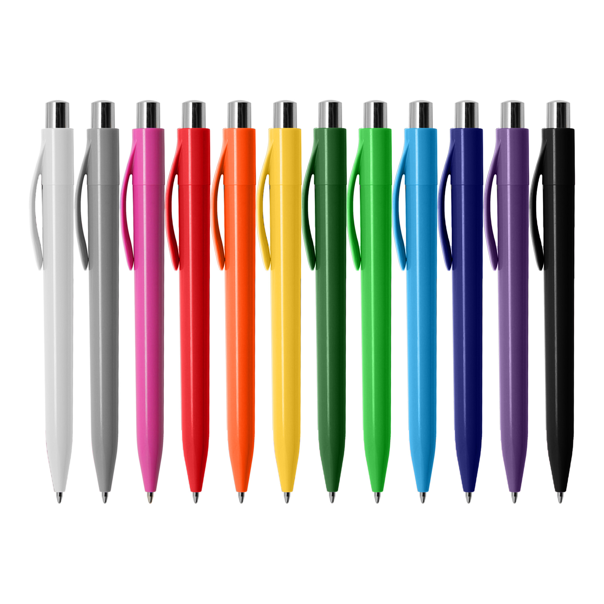 Retractable plastic pen with silver chrome push button simple design with large colour selection. It has high quality German manufactured black ink refill 1800 meters writing distance tungsten carbide ball provides you with quality writing.