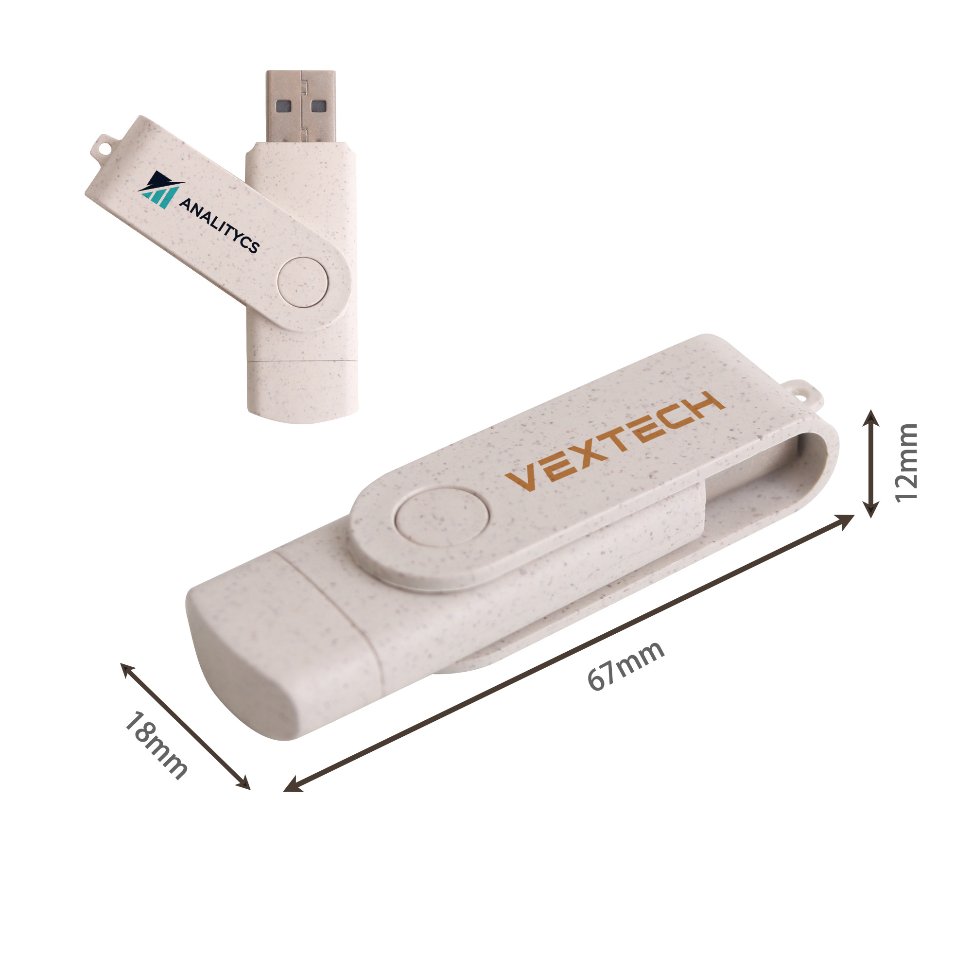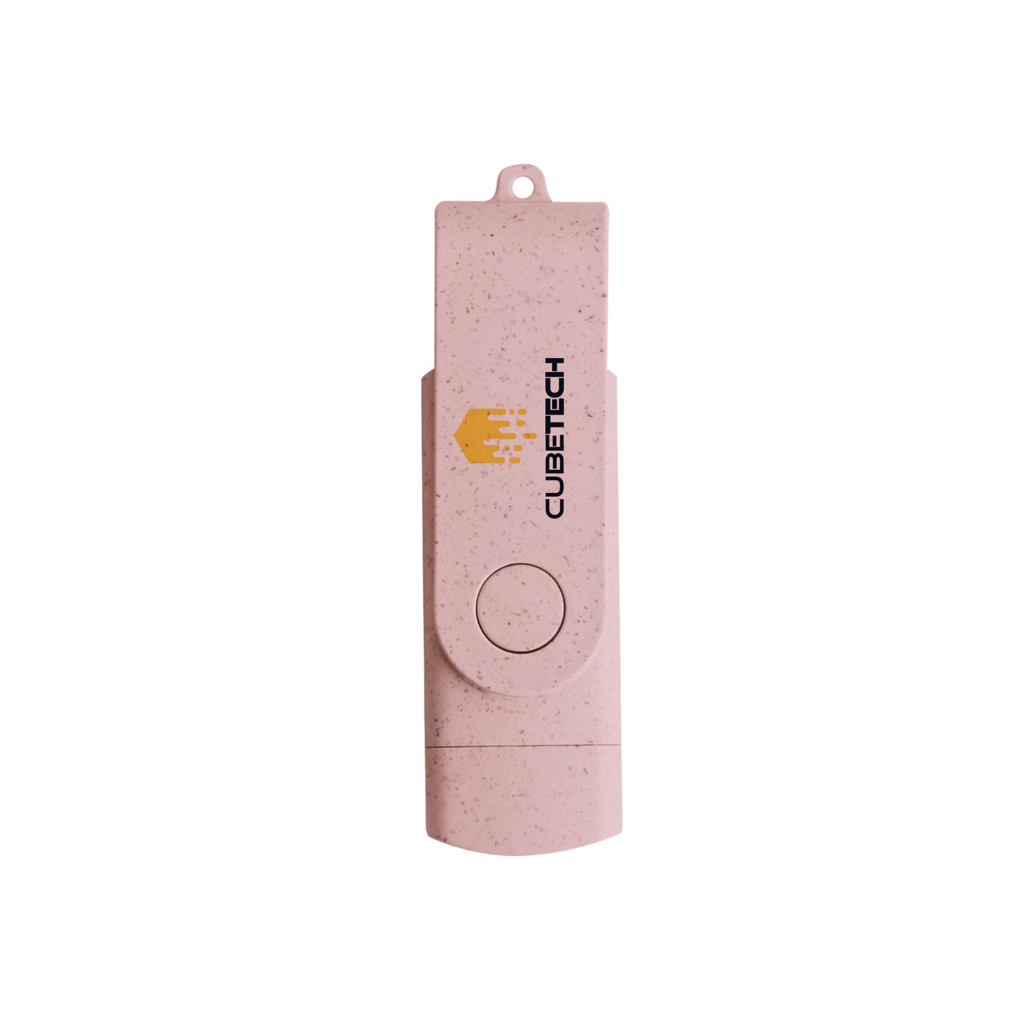 Make data upload and data transfer easy and Eco-friendly! Made of wheat straw with a matching swivel, it is lightweight and environment-friendly. This flash drive features a default traditional USB connector on one end and a Type-C connector on the other. Complete with screen print or UV print to showcase your design.