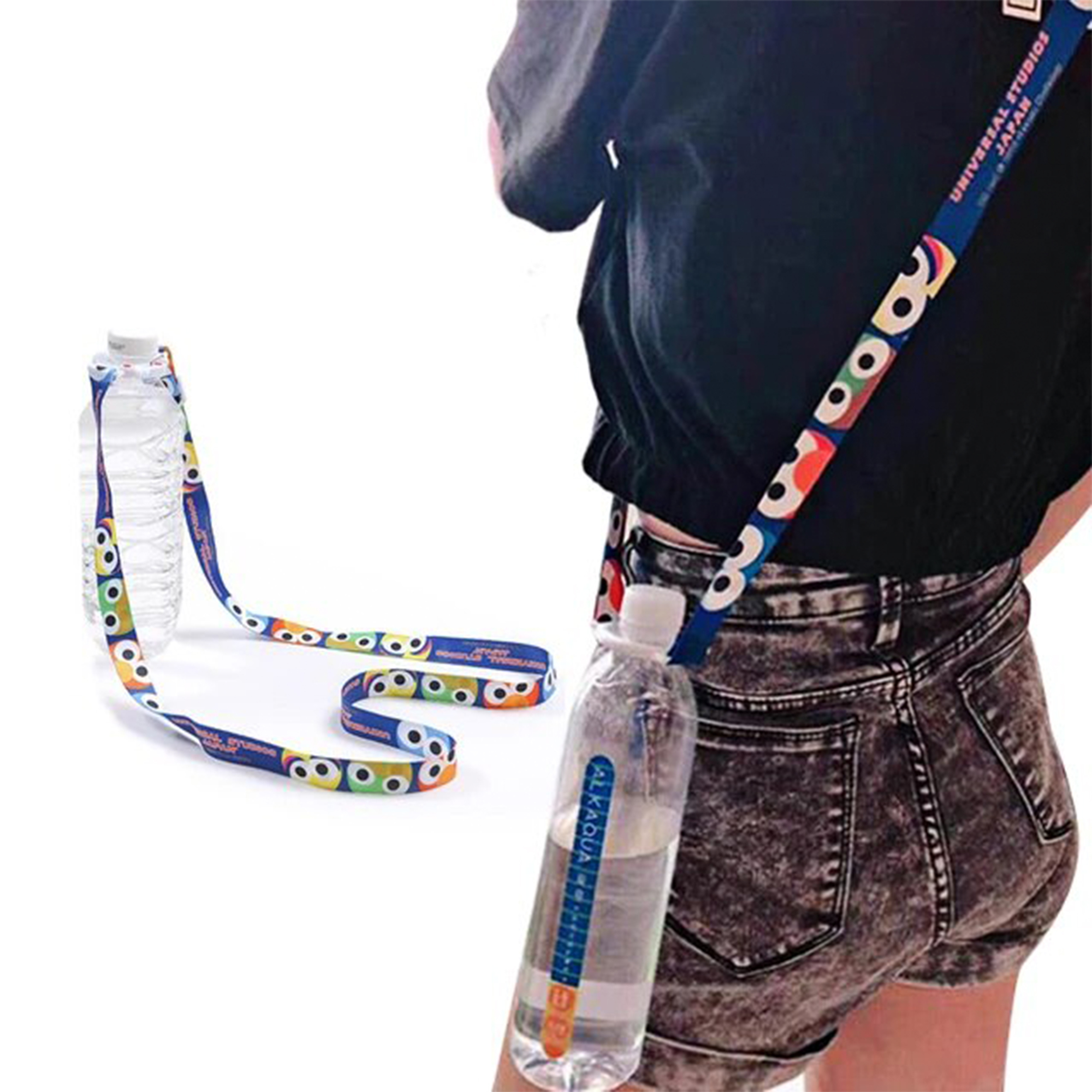 Drink bottle sling lanyard for adults and kids. Full colour sublimation lanyard using ultra fine silk like polyester material to be printed edge to edge on both sides. Comes with buckle that has two adjustable positions and can fit two size water bottles of 25mm and 32mm. Adjustable shoulder strap with max length of 508mm and minimum length of 266mm. Good for carrying water bottles or beer bottles on the go. Also great for sports keeping your hands free with the water bottle clip holder.