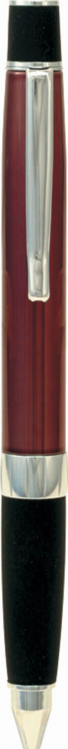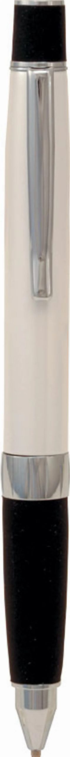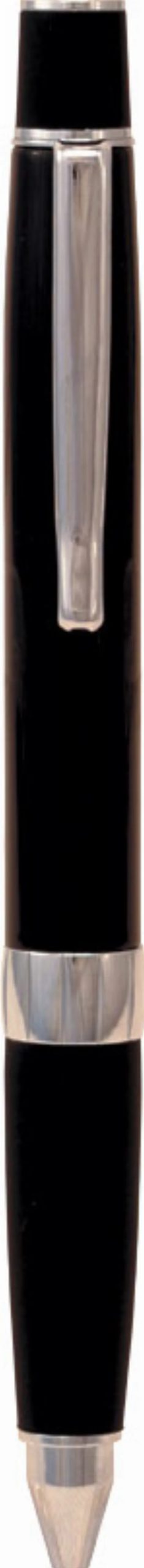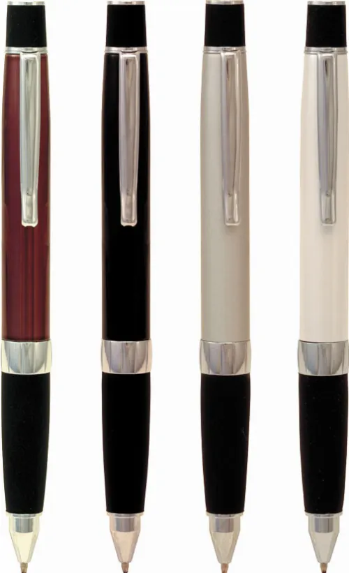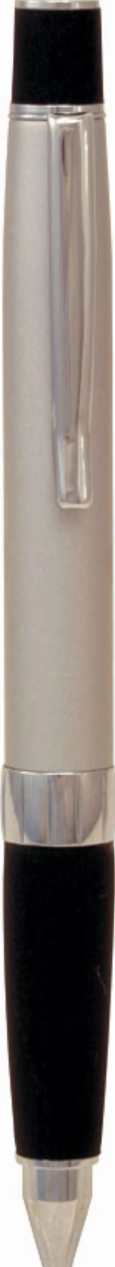 A twist action metal pen with black rubber grip, silver trim and a metallic finish. Parker style black refill.