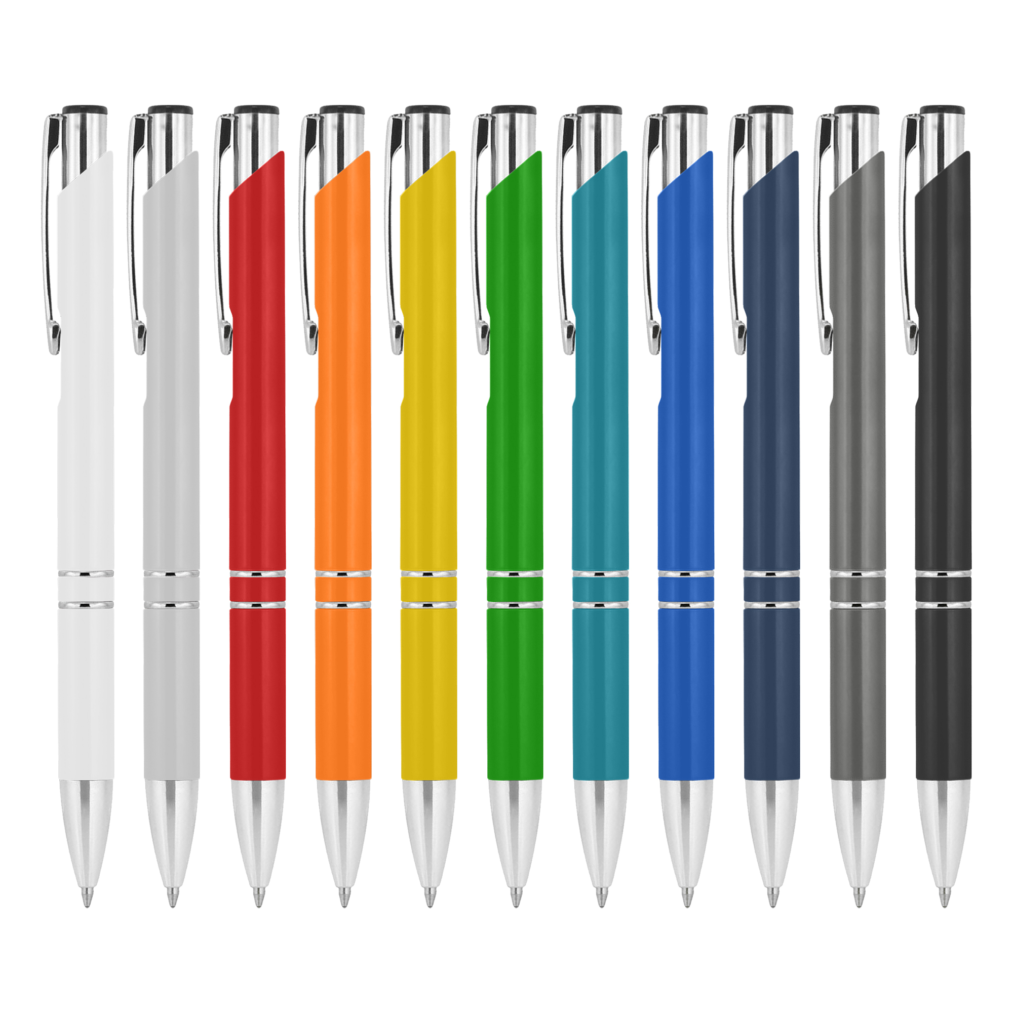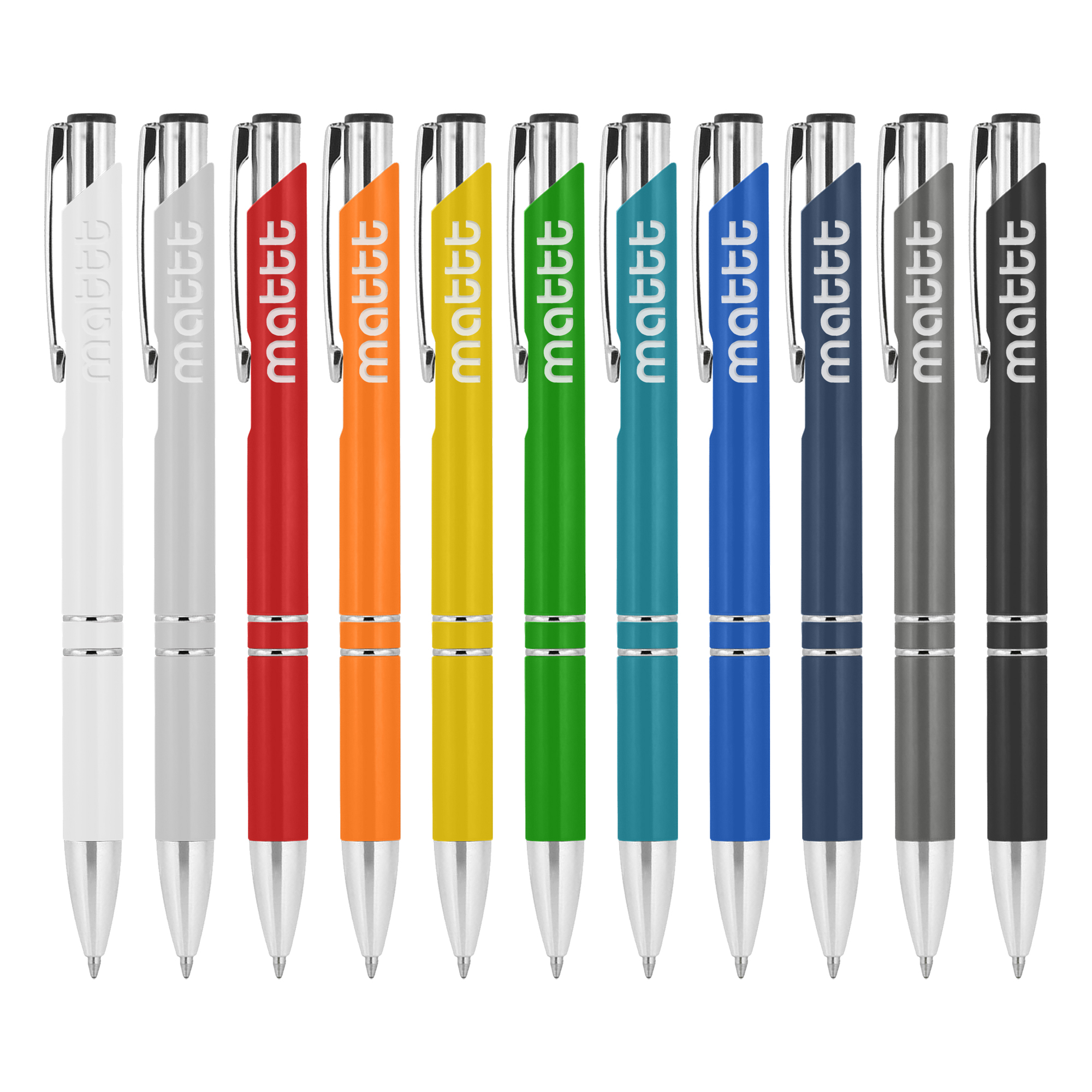 Popular aluminium stylish design pen with shiny silver fittings and matt finishing barrel click action with plastic Parker-Type German manufactured black ink refill 1200 meters writing distance tungsten carbide ball provides you with quality writing.