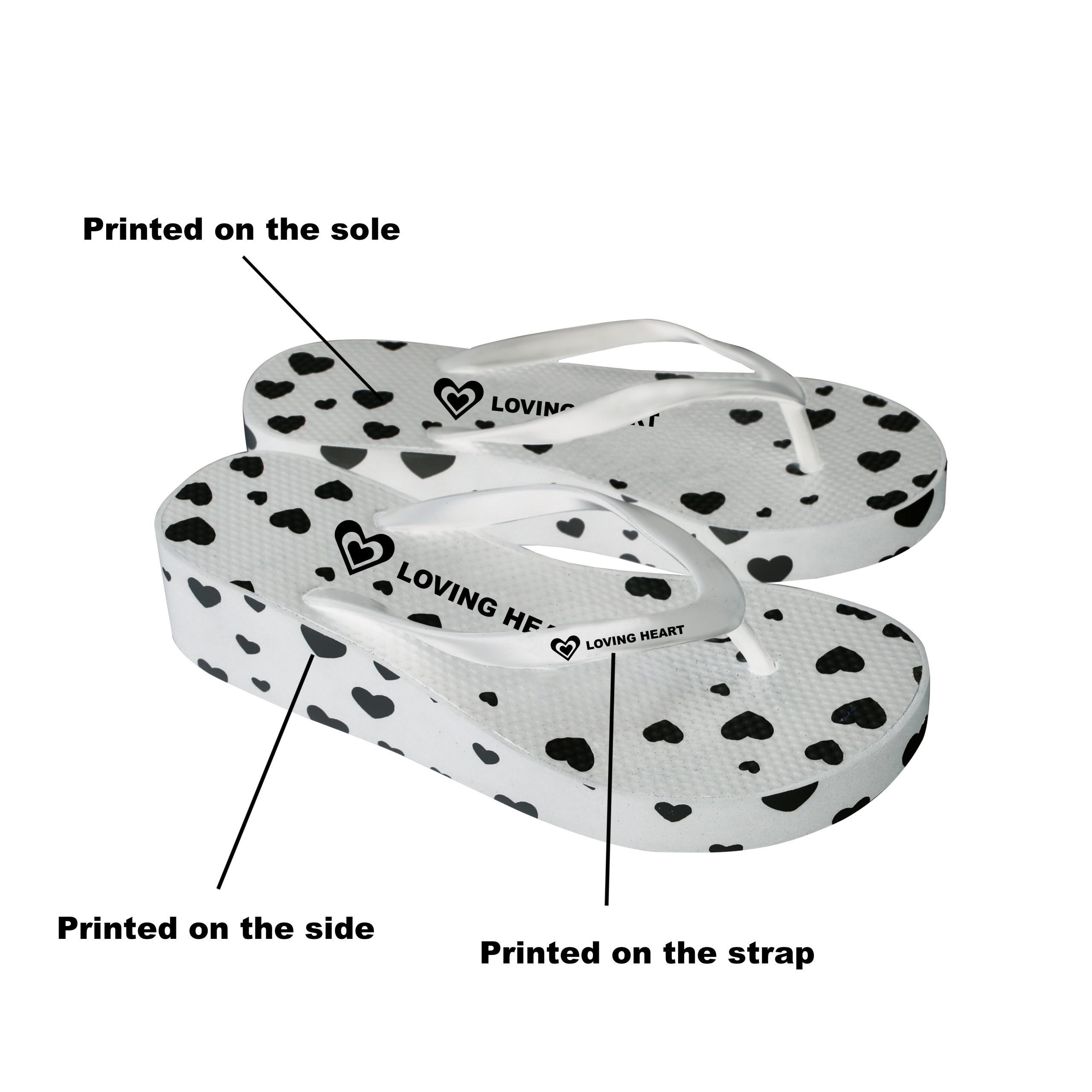 Screen print / UV print on the sole: Full size<br/>Screen print on the side: Full size<br/>Screen print on the strap: 7 x 1 cm