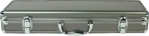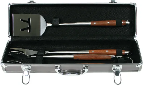 Executive BBQ set, with forged stainless steel tongs, fork and spatula with Rosewood hadles all packed in an Aluminium carry case.