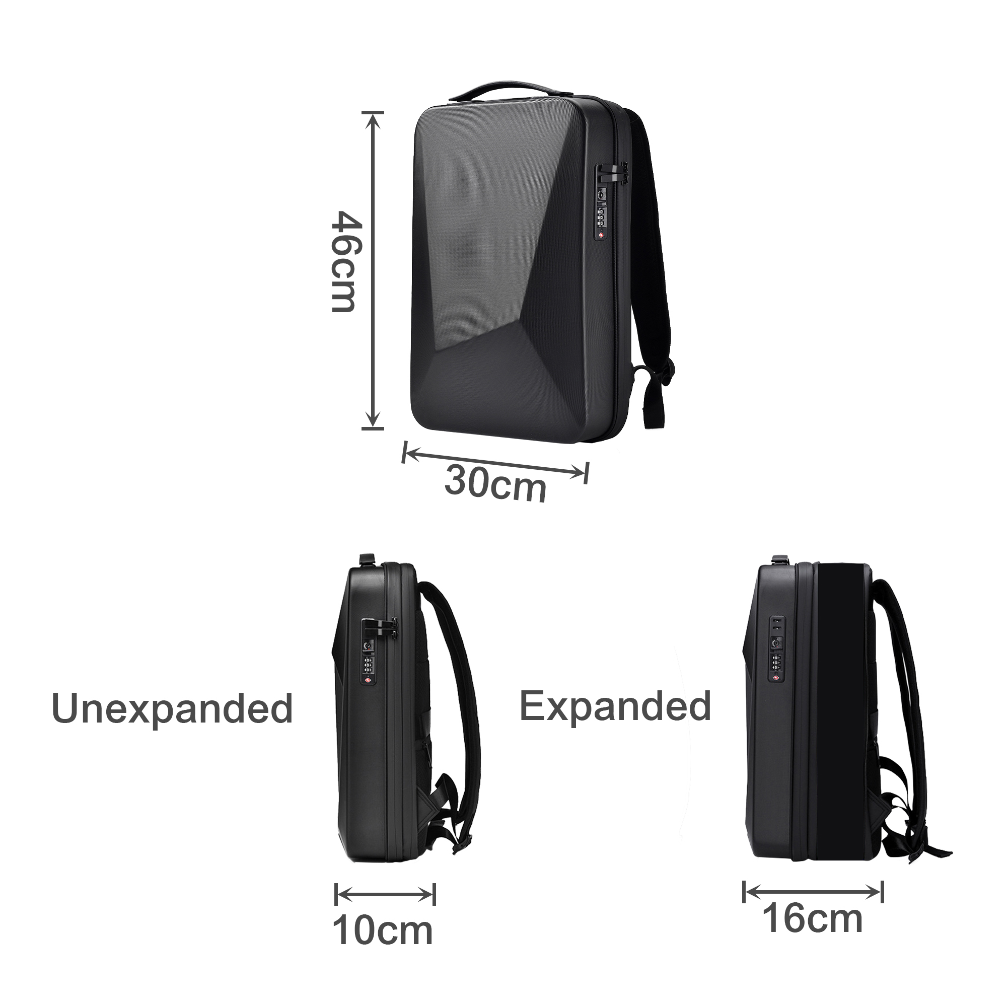 - Fits up to your 16″ laptop with expandable capacity, featuring a coded lock and a USB and Type-C charging