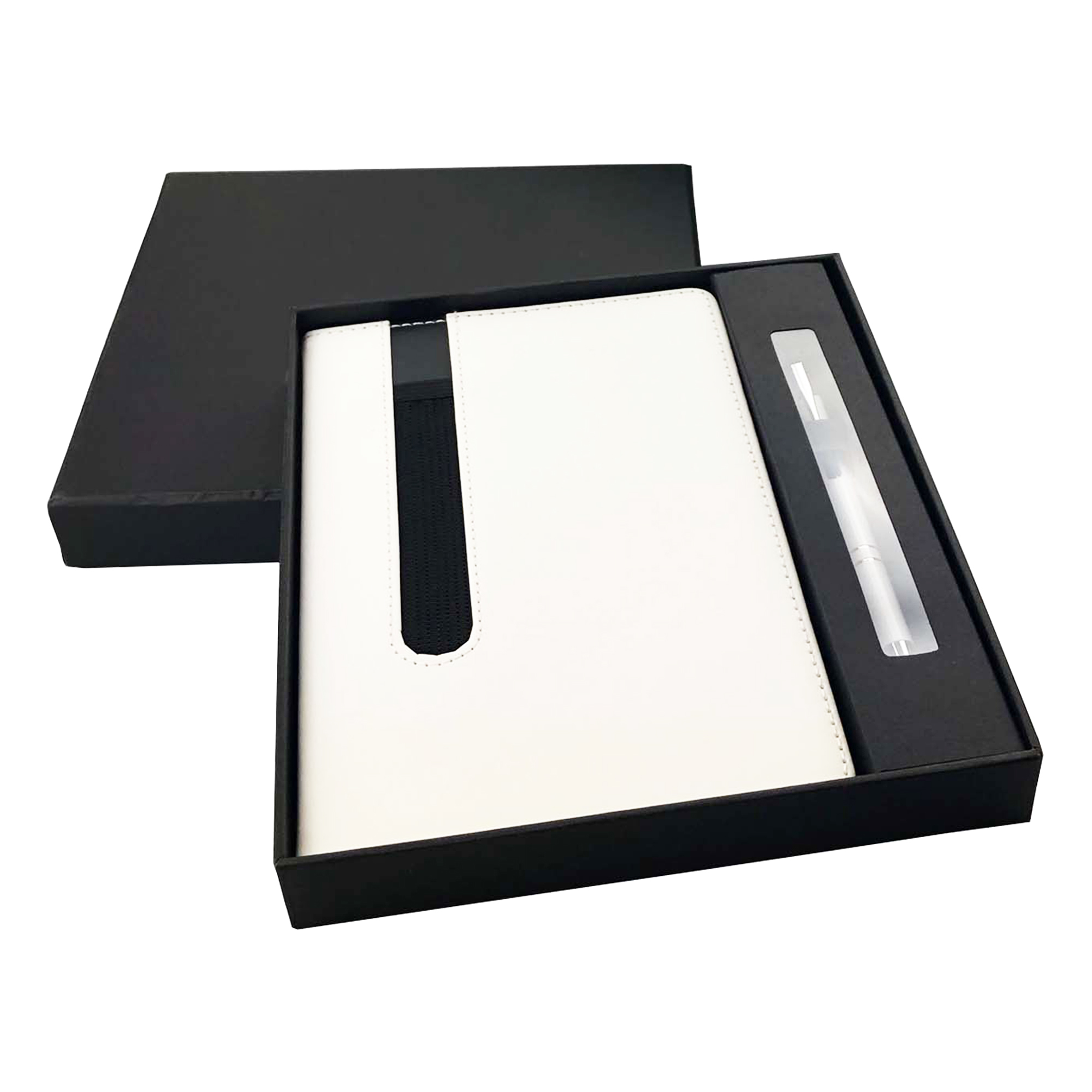 This A5 soft touch PU leather notebook features a built-in black pen sleeve, 80 lined off white pages, black elastic closure, and a matching fabric bookmark. Paired with a stylish aluminium pen with a Parker Type German refill, both are presented in a durable black cardboard gift box, perfect for gifting.