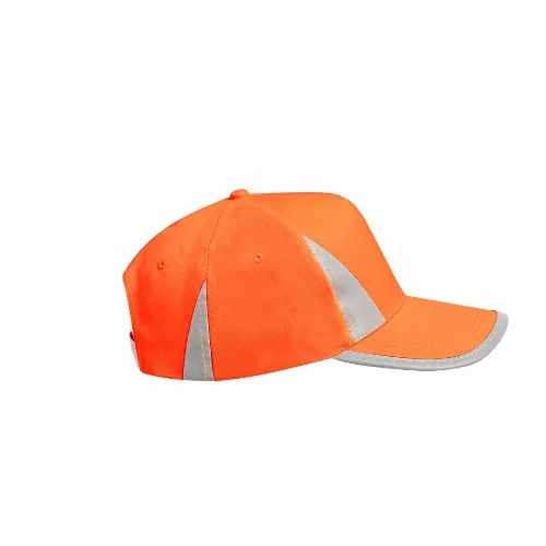 Adjustable and reflective velcro fastening at the back. In fluorescent yellow or orange with reflective elements on visor, front panels and back.