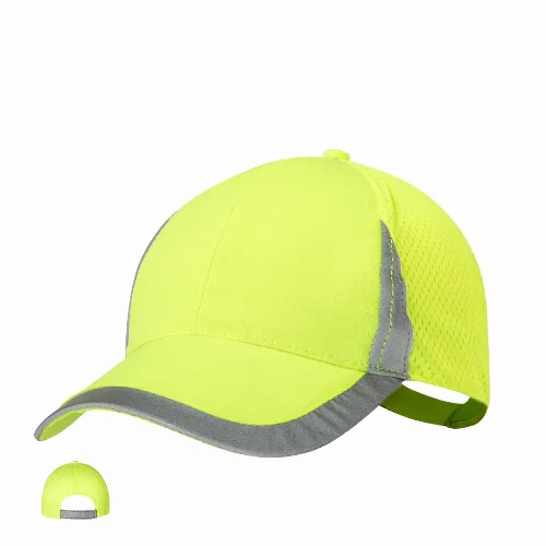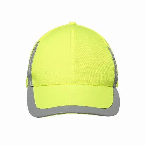 Adjustable velcro fastening and breathable mesh at the back. In fluorescent colour with reflective elements in visor, front panels and closure.