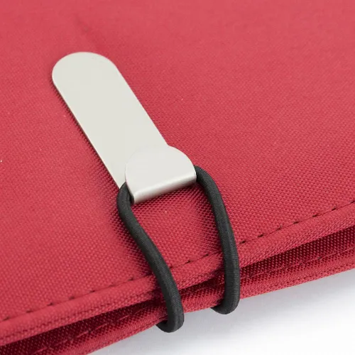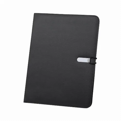 In soft microfiber, with elastic band metal closure especially designed for laser printing. Inside with notepad of 20 blank sheets, 3 flap pockets, card holders and pen holder.