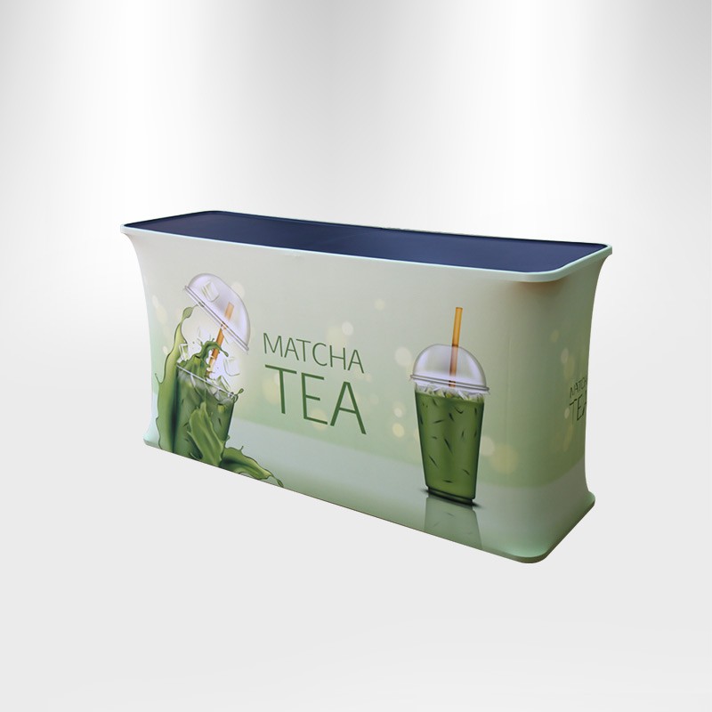 Create a custom tradeshow display with our new Stretch Table Covers with Open Back. Made of 240g Elastic Polyester, that will give your booth a professional appearance. The tablecloth can be sublimation printed with all colours and different patterns. The open back design make it easier to store items at events while keeping the front neat and tidy. Rubber foot sets on the inside are attached to the table legs to keep the tension tight. It's ideal for promotional events and tradeshows to add an extra visual element to your display.