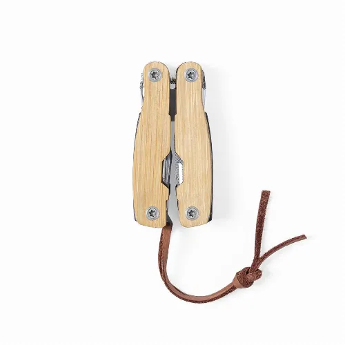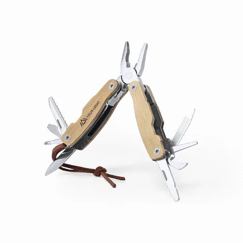 Multi-tool with resistant stainless steel body and bamboo handle, 12 functions.