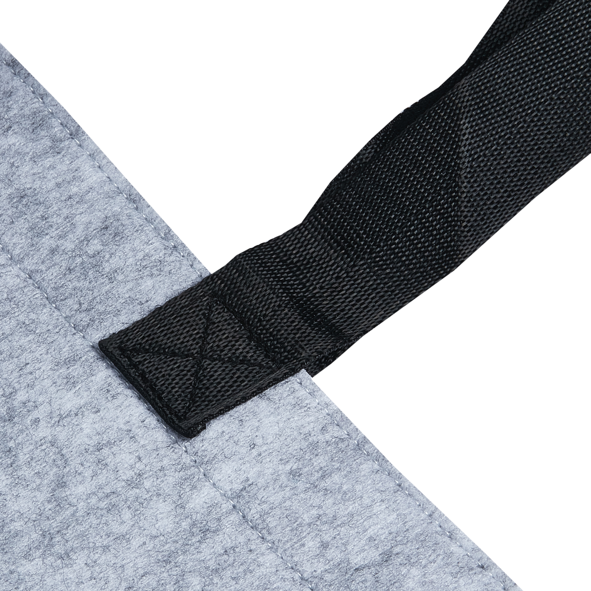 Large light grey 3mm thick felt shopping bag. Black webbing handles with top button closure. A great high quality fashion carry bag.