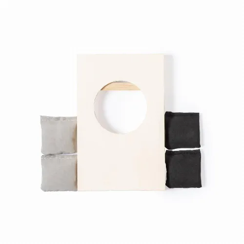 Hole in base, with 4 bags filled with sand in 2 colours. Presented in an individual box with kraft design.