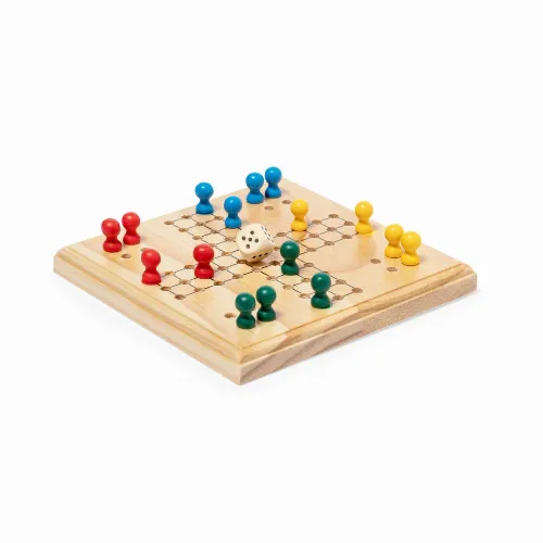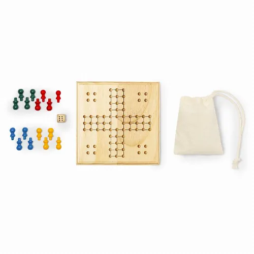 Contains a board, 16 counters in 4 different colours and a dice. Suitable for 2 to 4 players. With handy cotton bag for storing the pieces. Presented individually in a kraft design box.
