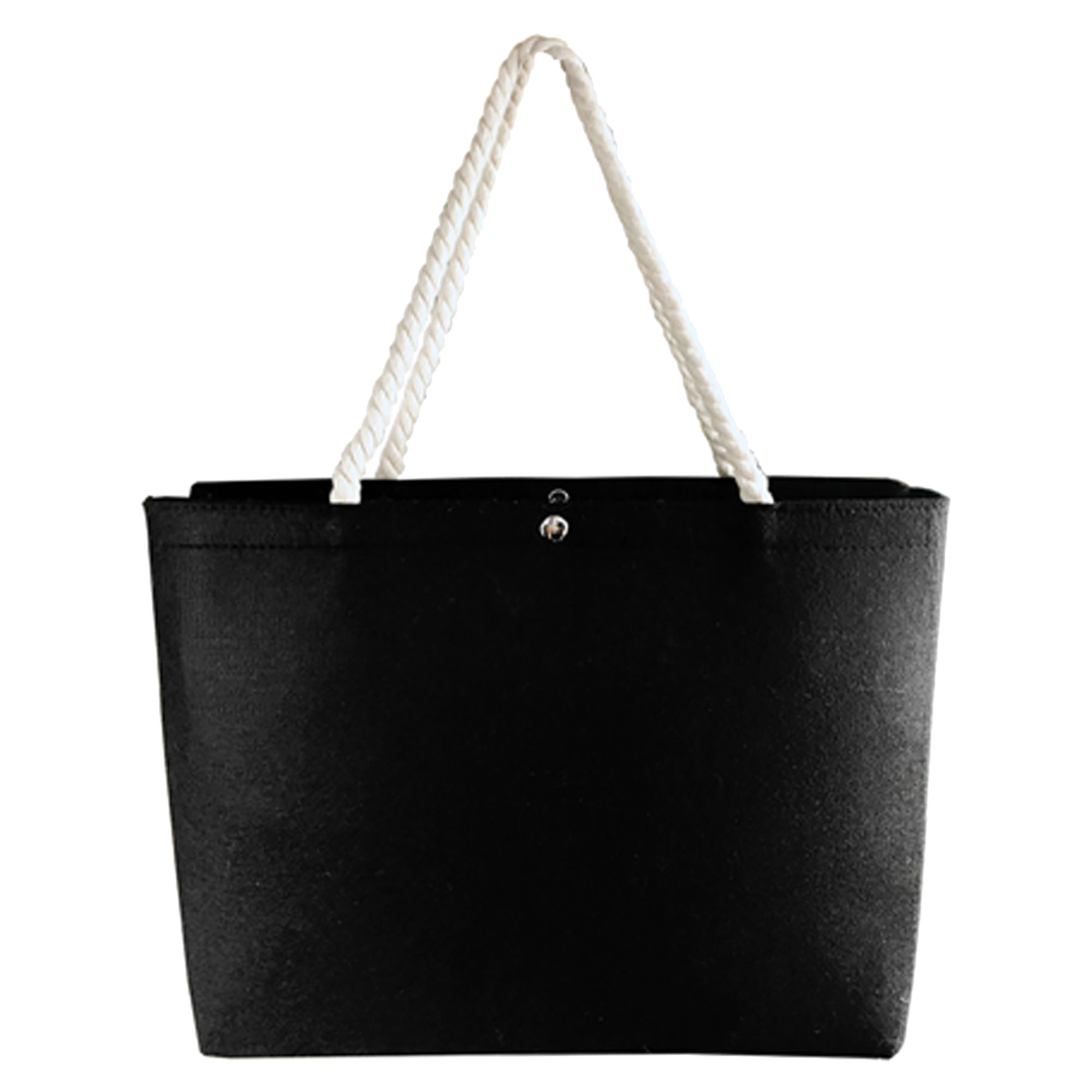 A fashion shopping bag is made of 3mm thick quality black felt fabric which is a durable moisture-repellent and heat-insulating material. Smart design comes with 2 comfortable thick rope shape handles and a top bottom closure. A great promotional bag for corporate events.