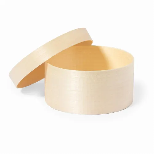 Presentation box in round format, made of natural wood with matching lid..