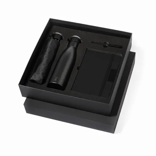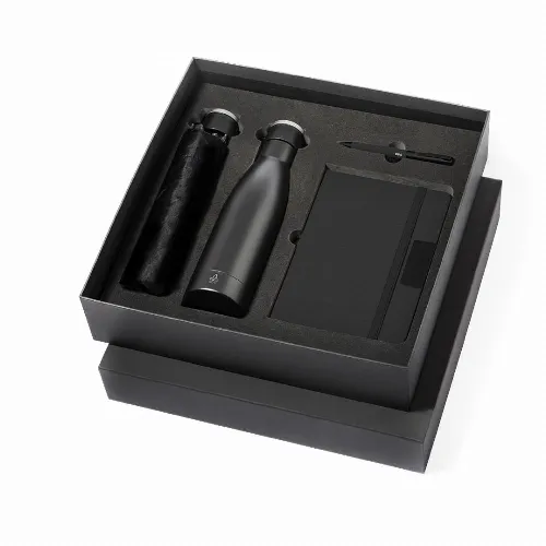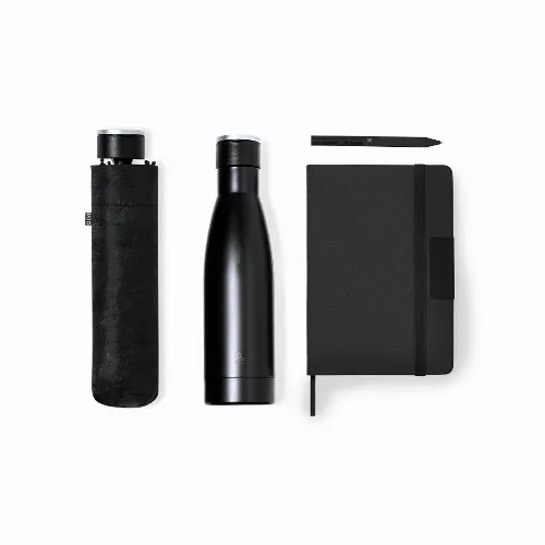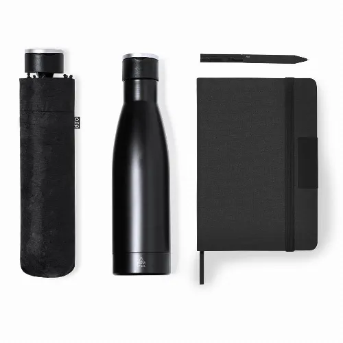 Matte silver metal handle, With stainless steel badge.RPET notepad in elegant black, with special metal detail for laser branding. Including elastic bands and fabric bookmark. Inside with 80 sheets, single-stripe layout. With RPET logo.98 cm diameter folding umbrella in black color. Made in 190T RPET pongee material. Manual opening, with windproof mechanism and fiberglass ribs. With carrying sleeve and matching straps. With distinctive RPET label.RPET ball pen with matt black finish, twist mechanism and blue ink. The RPET material is made from recycled plastic to encourage the reuse of plastic waste and help the sustainability of the planet.Set presented in an individual matte-finish, case with inside die cut for each of the elements of the set.
