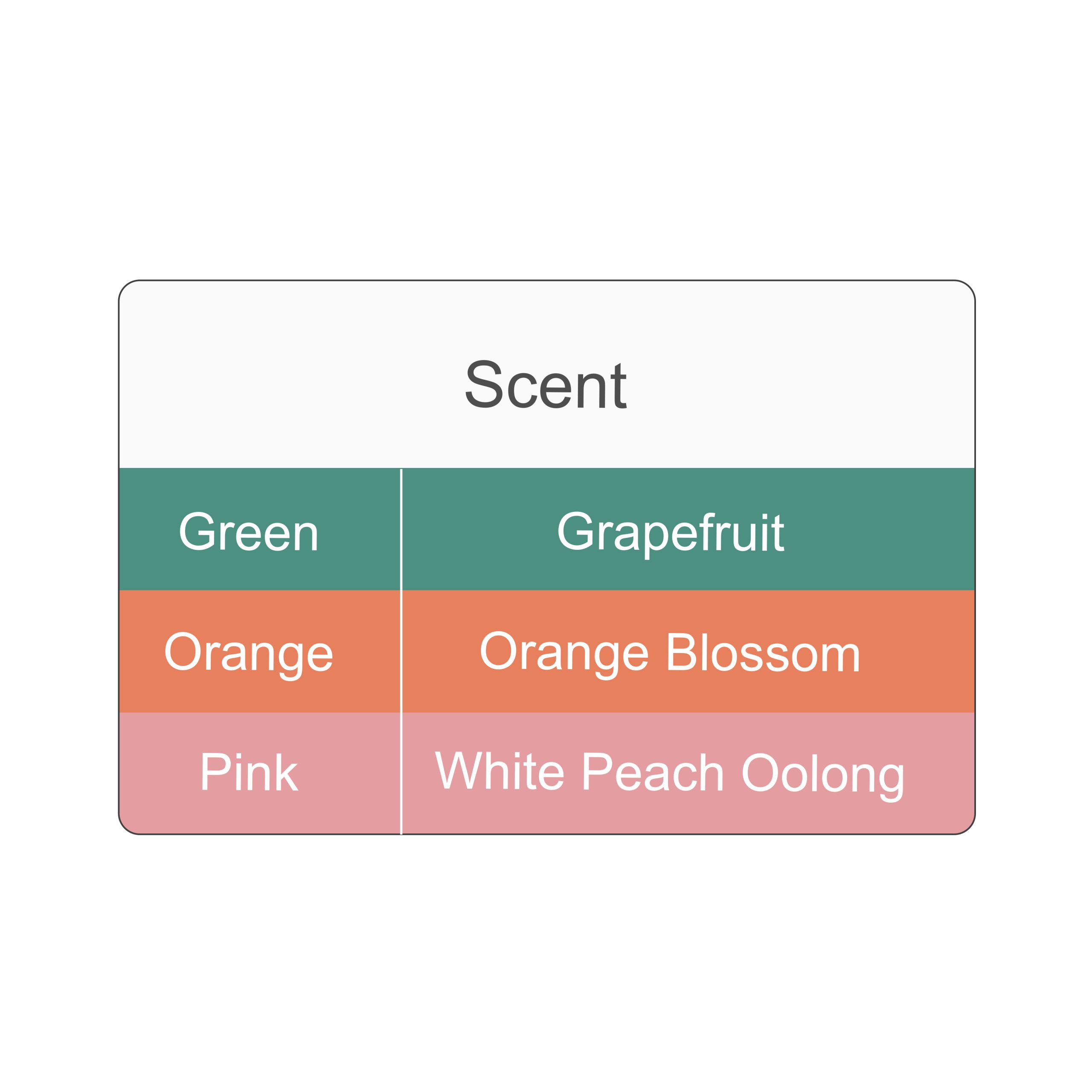 • Scents available include White Peach Oolong, Orange Blossom, and Grapefruit