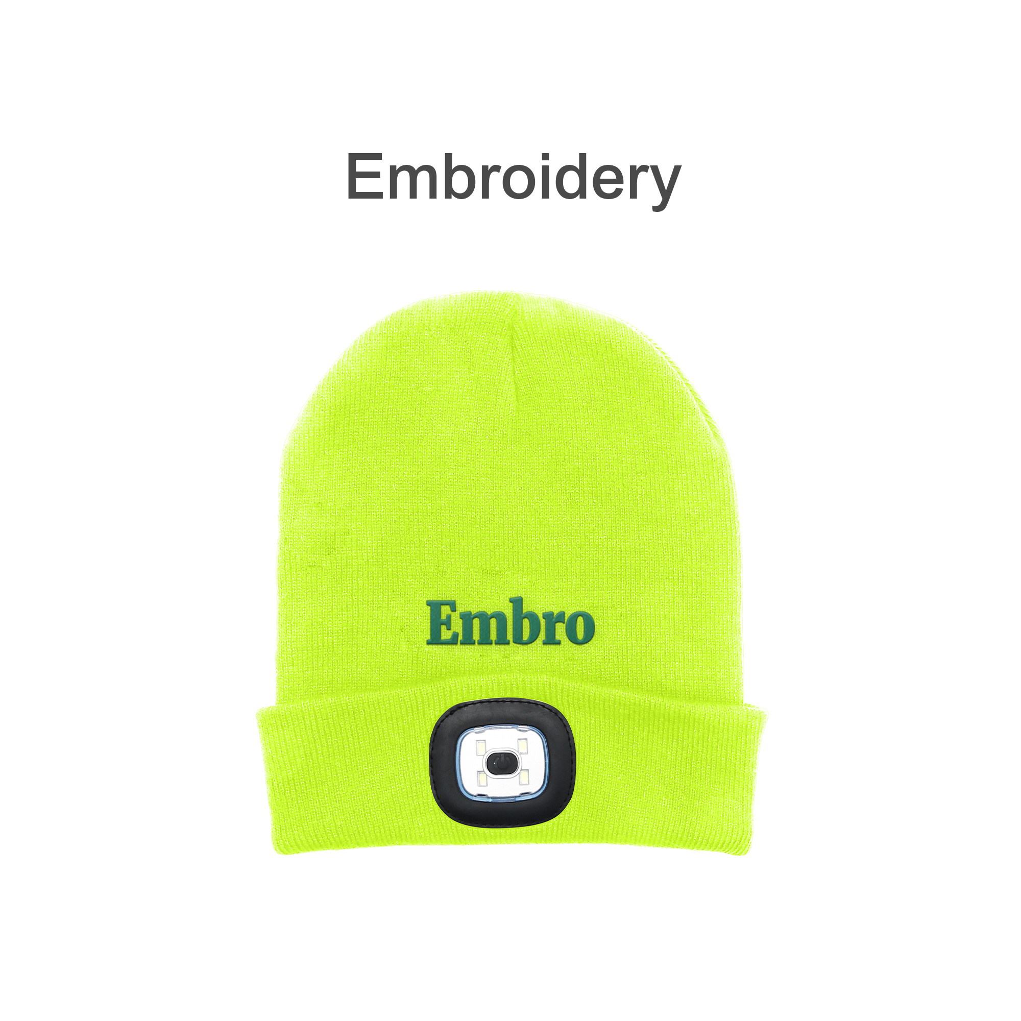 Elevate your style with our Headlamp Beanie! Crafted from elastic acrylic fibre, it boasts a soft touch and superior warmth for cold days. The hat features a roll-up cuff, with Embroidery and Woven Labels to showcase your design. It comes in 4 trendy colours. The headlamp lights up dark areas without using your hands, and it’s detachable for charging.