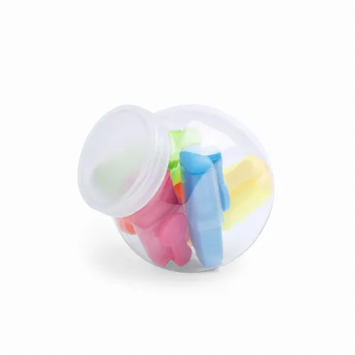 Original set of fluorescent markers of minimalist design in five colors, presented in a boat with transparent body and white screw-on cap with smooth surface for printing..