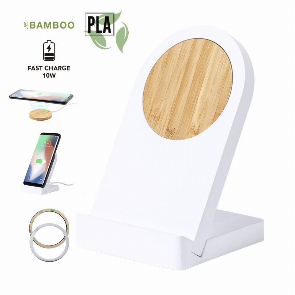 Wireless charger made of bamboo, and case in PLA -Poly Lactic Acid-, which is obtained from 100% natural resources such as corn starch, yucca or sugar cane, able to become 100% compostable at the end of its lifespan. With 10W fast charge function and compatible with devices equipped with wireless charging technology. Includinf adhesive metal ring and 100 cm USB connection cable. Large branding surface and presented in an attractive eco-design box. PLA emblem on the item.