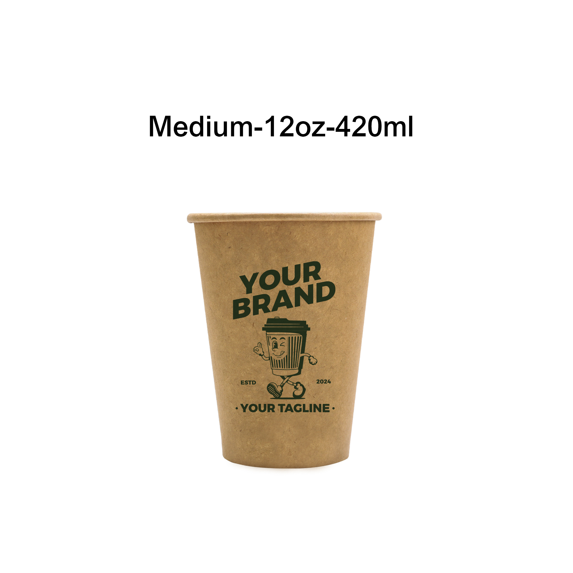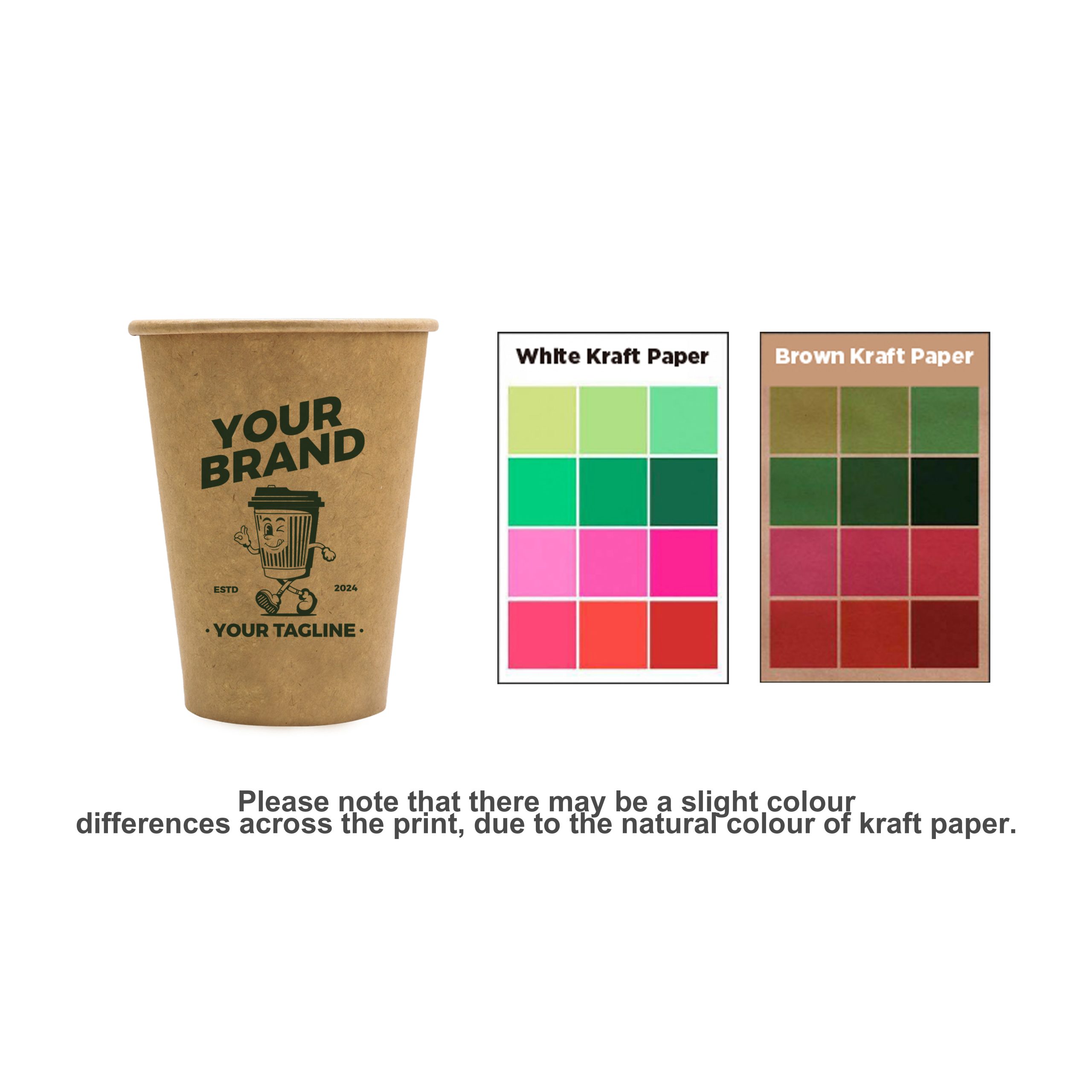 Please note that there may be a slight colour differences across the print, due to the natural colour variations of kraft paper. Base price includes one spot colour. Gradient printing is not available. We recommend using a darker print colour for best results. For additional spot colours, please contact us.<br/>Iced drinks may cause condensation and soften the cup. For cold beverages, double walled cups or plastic cups are recommended.