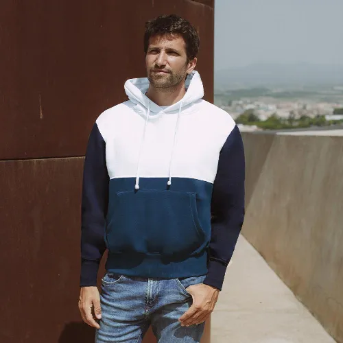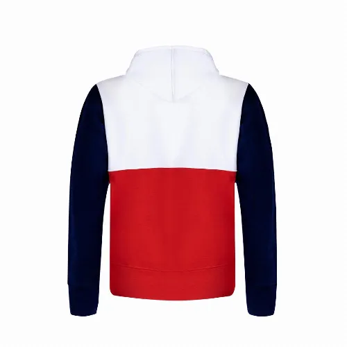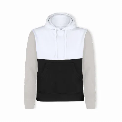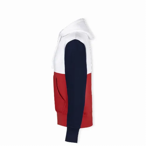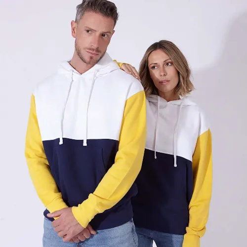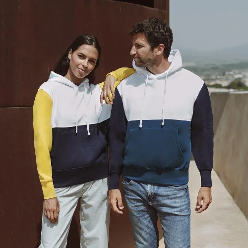 Tricolor unisex hooded sweatshirt, with kangaroo pocket and extra wide elastic bands for a perfect fit.