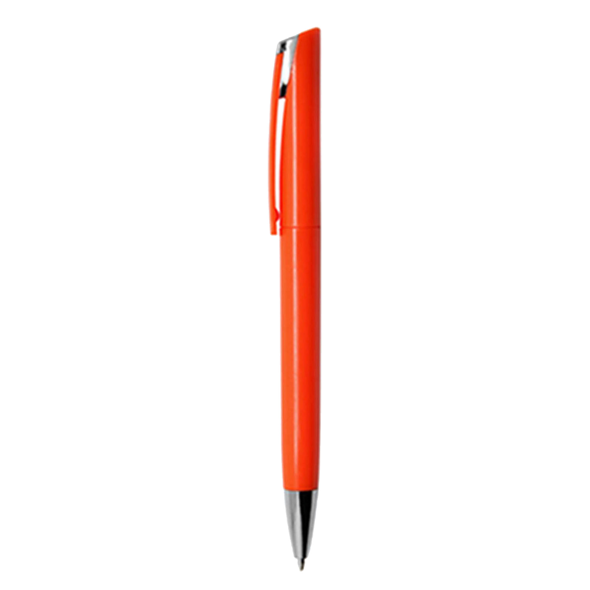 A quality plastic pen designed by European designer twist action with silver chromed tip and clip joint coloured solid plastic barrel high quality German manufactured black ink refill 1800 meters writing distance tungsten carbide ball provides you with quality writing.