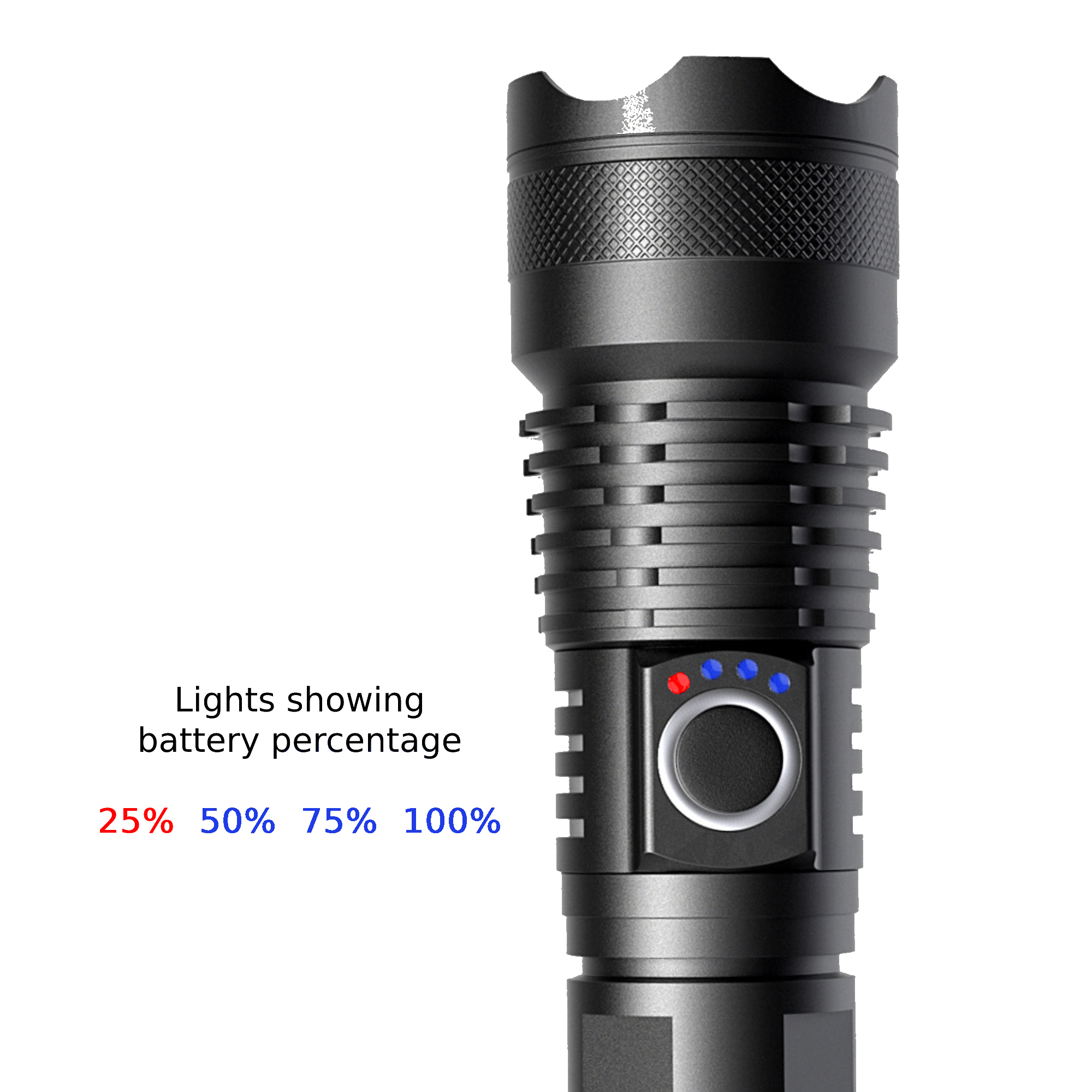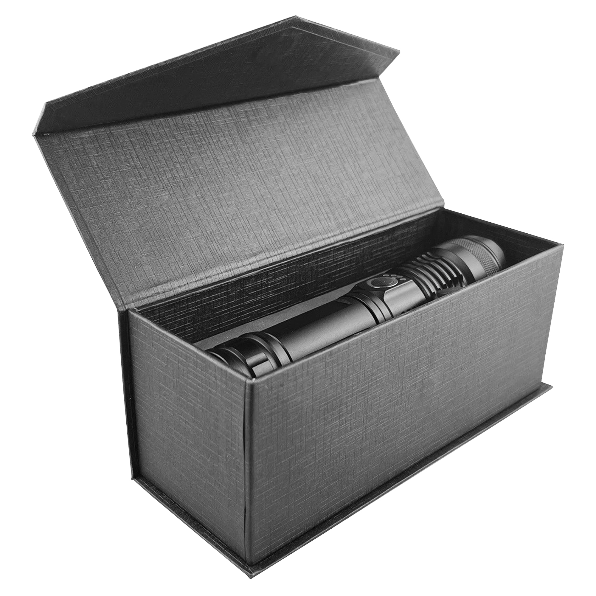 3 Watt black metal torch with bright LED and an push and pull action adjustable beam setting. Presented in a black gift box which can also be printed on. Comes with White USB charging cord and 2200mAh rechargeable battery. AAA batteries not included.