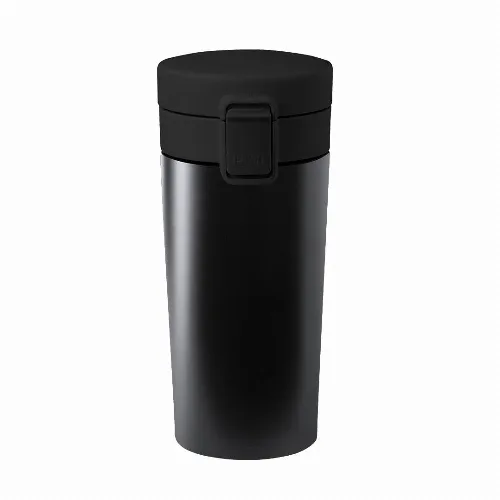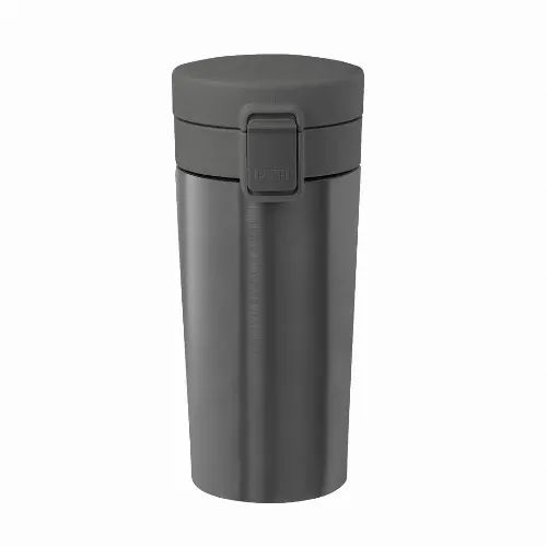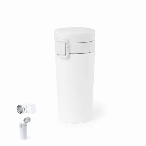 Stainless steel thermos tumbler, with double wall and 380 ml capacity.
