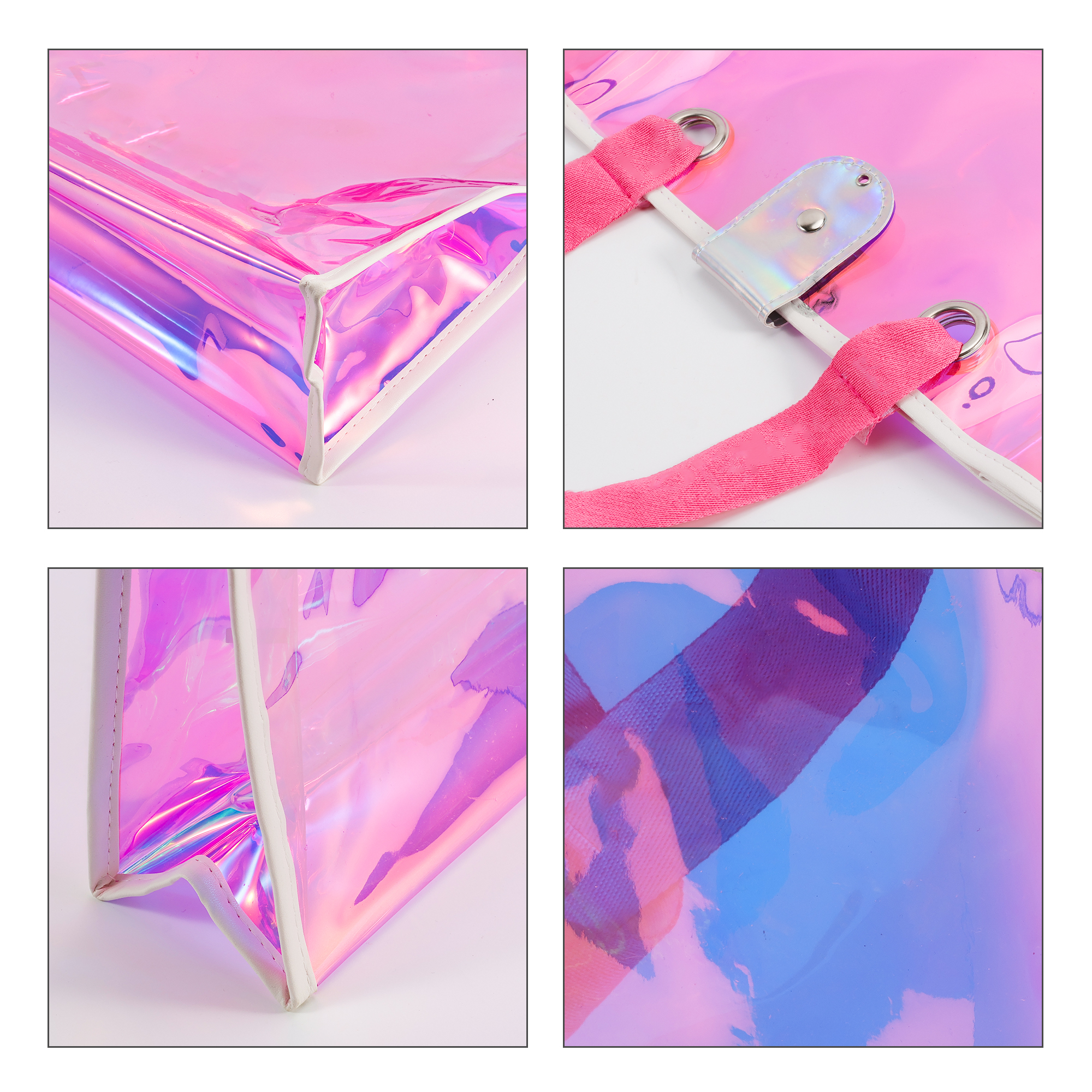 Our Iridescence Clear Tote Bag with holographic design showcases a variety of colors! Under the light, this laser-designed bag will show different Iridescent colors, which are very eye-catching. Made from 0.4mm thickened transparent PVC material, which is waterproof and durable. With screen print to highlight your brand. Suitable for shopping, beach, concerts, travel or other occasions.