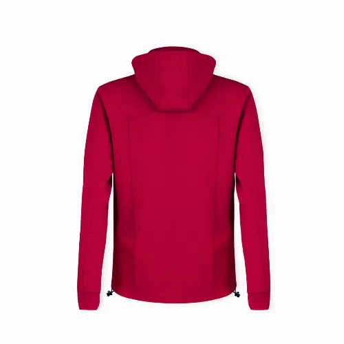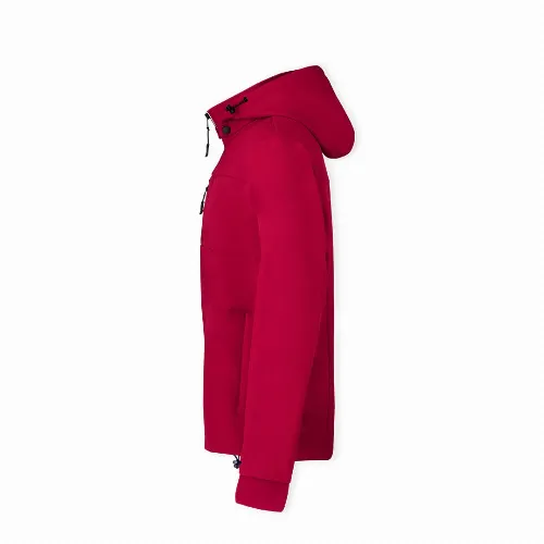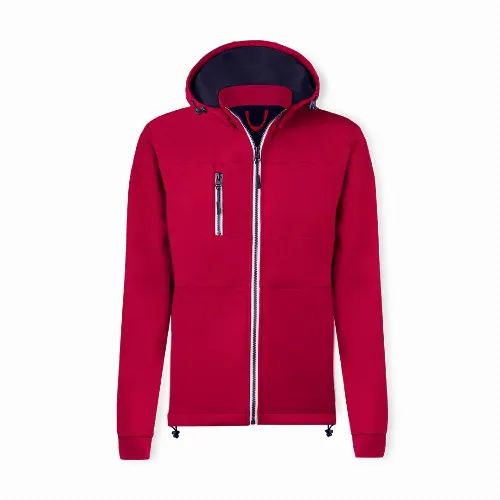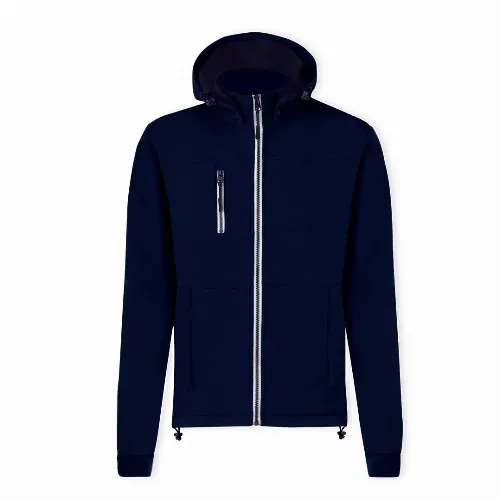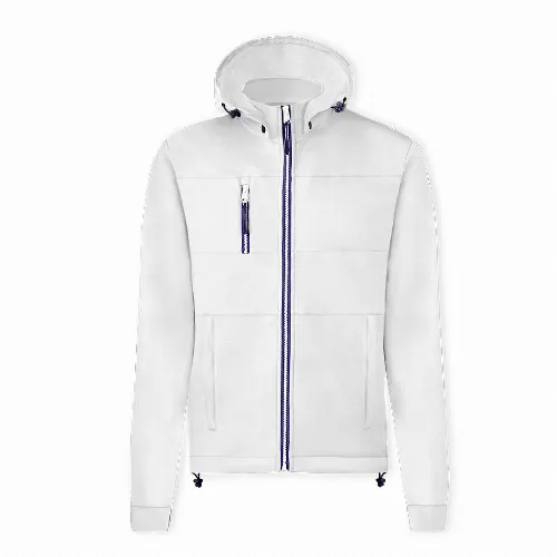 Modern fit with central zip, side pockets and practical chest pocket with zip fastenings and contrasting zip pullers. Stand-up collar with adjustable and detachable hood. Bottom hem with adjustable string. Wind and water resistant soft shell outside, and warm micro fleece lining in contrast colour. Available in sizes XS, S, M, L, XL, XXL.