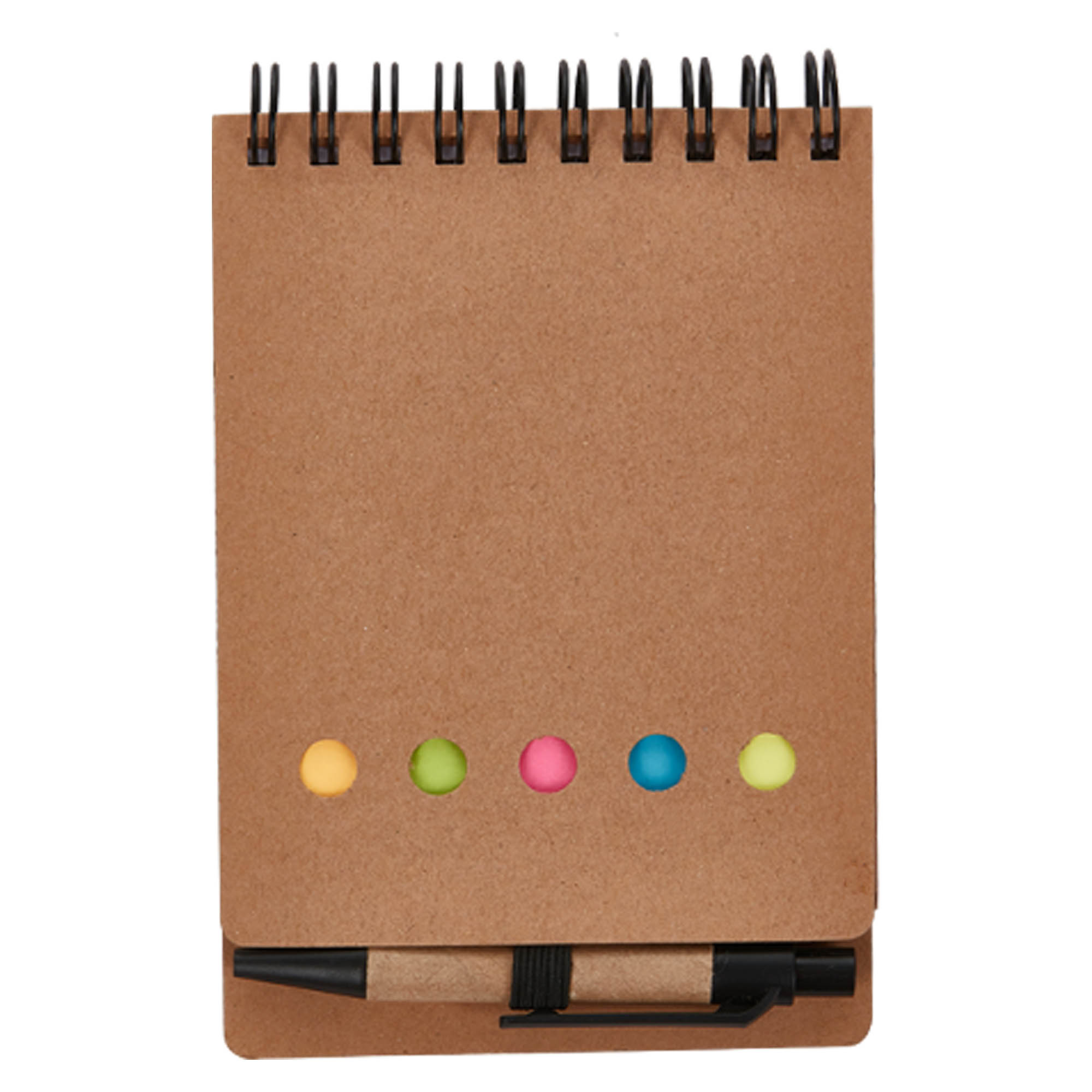 A spiral bound multi-purpose note pad has a 60 leaves(120 pages) lined note pad a 25 leaves yellow adhesive note pad five different coloured paper pads of adhesive flags (orange green pink blue yellow) and a recycled cardboard barrel pen slips into the elastic retaining closure. Unbleached natural cardboard cover. A very handy notebook and note pad for office staff and students.