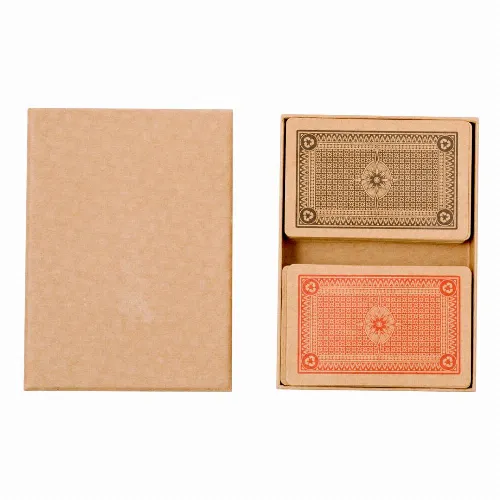 Spanish deck with 50 cards and French deck with 54 cards, presented in a kraft cardboard box with lid.