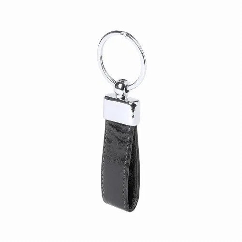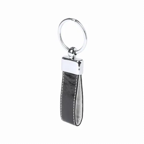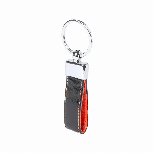 Keychain in elegant bicolor PU leather finish with metallic accessory.