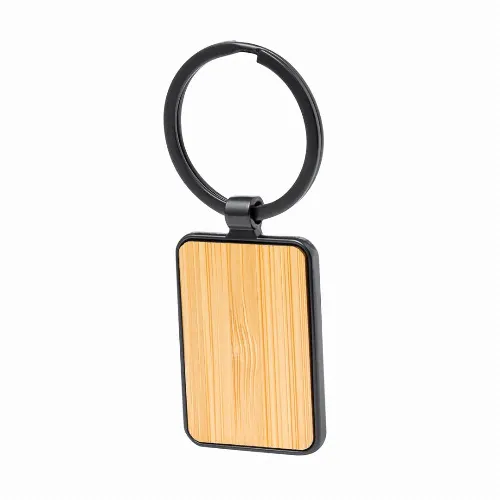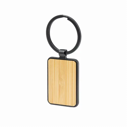 Elegantly designed keyring, made of black polished metal, with a soft bamboo side.