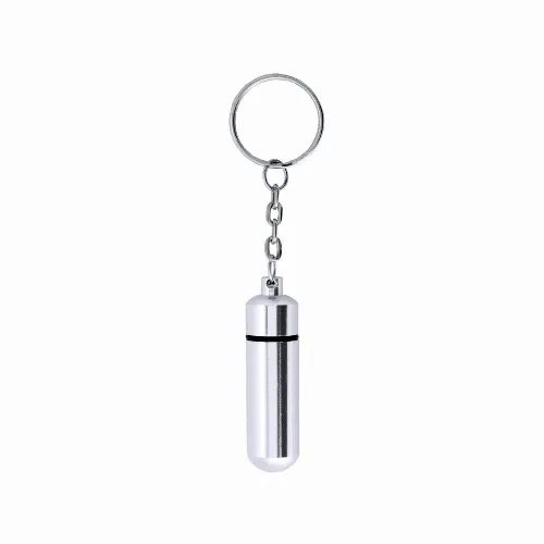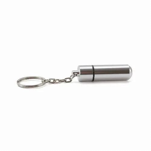 Discreetly designed pill case keychain with aluminum body, in glossy finish and with screw-on lock..