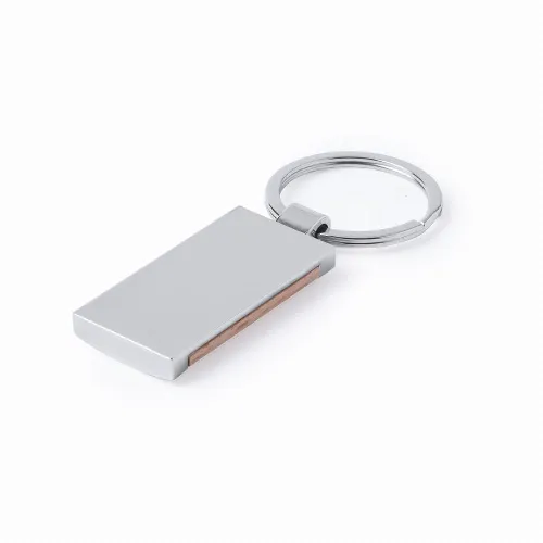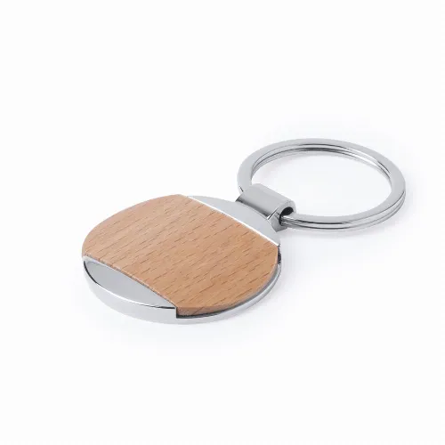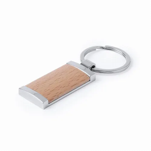 Keychain in combination of metal materials with a glossy finish and natural wood.