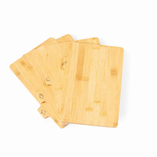 Set of cutting boards made of bamboo, each one easily identifiable by the cutting patterns, carved specifically for fish, white meat, red meat and vegetables.