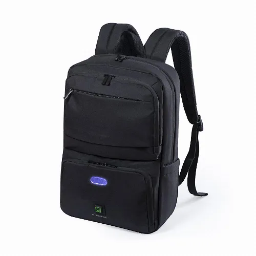 Made of durable 600D polyester, with a multitude of outer pockets and padded inner pockets for laptops up to 15 inches and tablets up to 10 inches. With USB connection, cable included. User manual available in Spanish and English. CE, RoHS and germicidal effectiveness certification available. For proper use of the product, avoid contact with skin and eyes.
