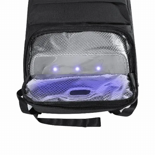 Backpack in resistant 600D polyester with integrated UV light sterilizer pocket and specially designed for the elimination of microorganisms and bacteria in smartphones and other everyday objects.
