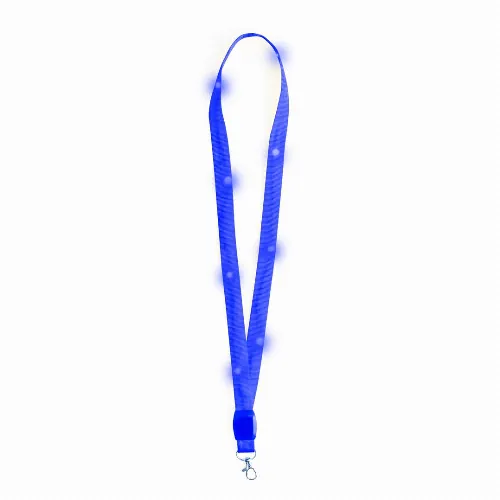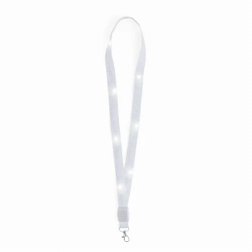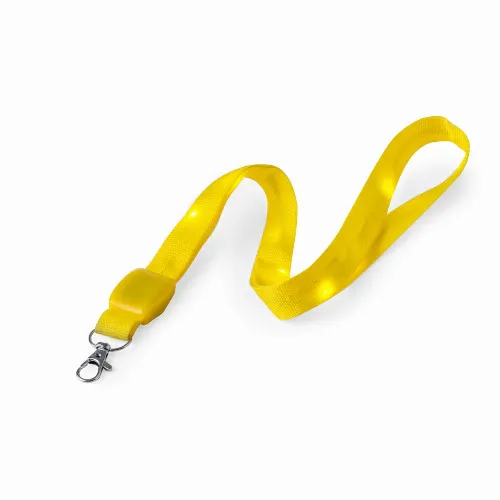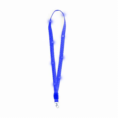Fun neck lanyard with 8 LEDs inside and powered by button cells (included). Including a hidden switch with three positions (steady light and fast/slow flashing light). With practical swivel hook.